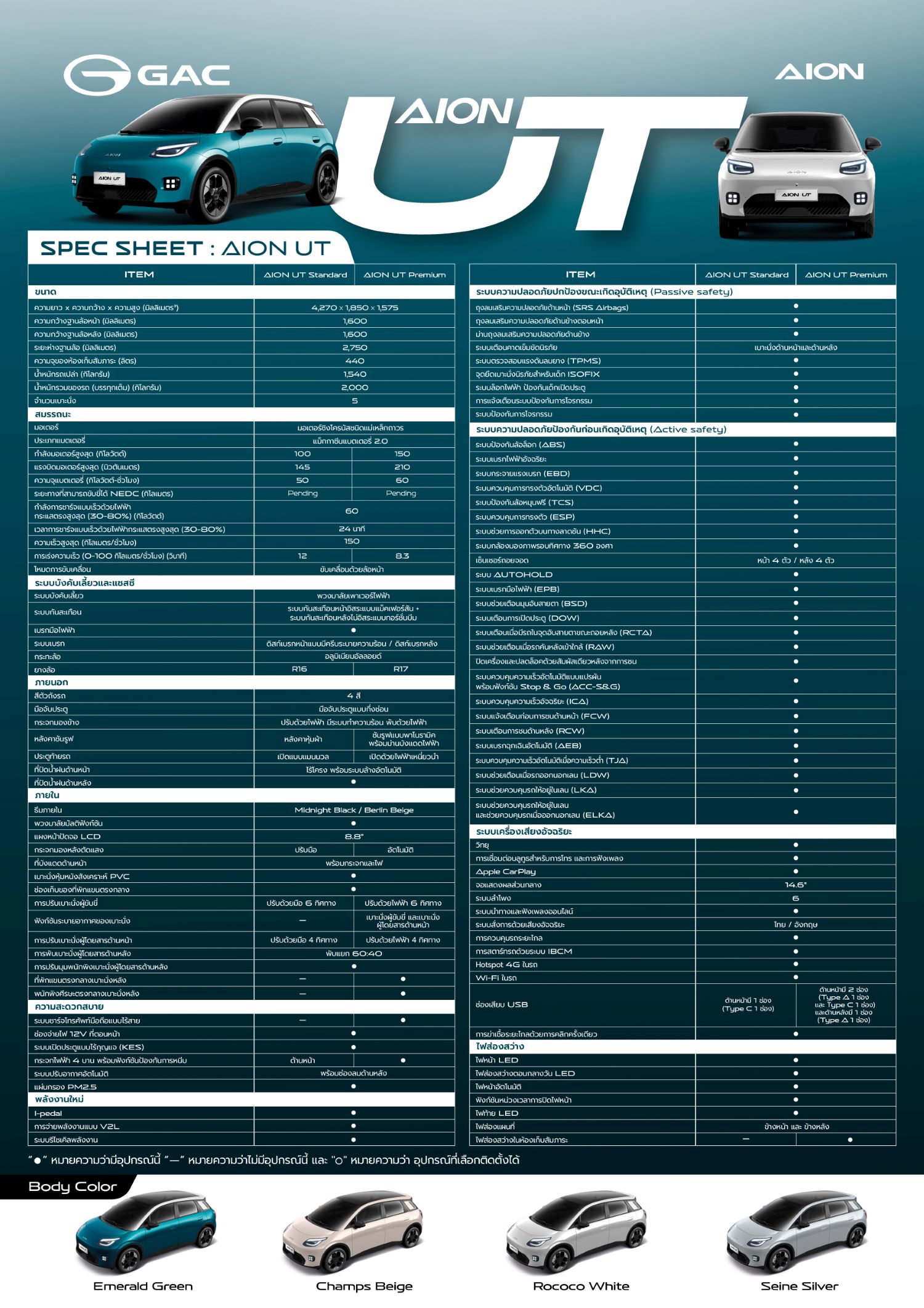 AION UT จัดว่าเป็นรถยนต์ไฟฟ้ารุ่นใหม่ล่าสุดจากค่าย GAC GROUP ที่มาพร้อมเทคโนโลยีทันสมัย มีด้วยกัน 2 รุ่น คือ AION UT Standard และ AION UT Premium มีขนาด 4,270 × 1,850 × 1,575 ม.ม. มีกำลังมอเตอร์สูงสุดที่ 100-150 กิโลวัตต์ แรงบิดสูงสุด 146-210 นิวตันเมตร แมกกาซีนแบตเตอรี่ ความจุ 50-60 kWh