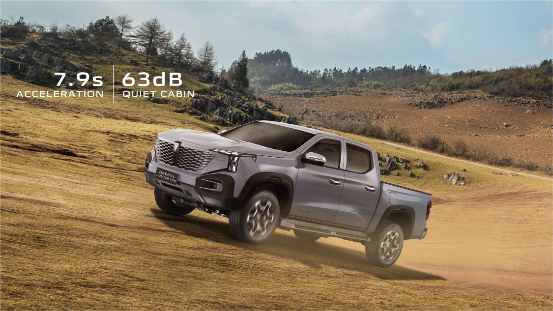DEEPAL HUNTER K50 มาพร้อมเทคโนโลยี Range-Extended Electric Vehicle (REEV) มอเตอร์ไฟฟ้าให้ระยะทางวิ่งสูงสุดด้วยไฟฟ้าได้ไกลถึง 131 กิโลเมตร (ตามมาตรฐาน NEDC) เทคโนโลยี Range Extender ทำหน้าที่ผสานขุมพลังระหว่างเครื่องยนต์ 2.0T-GDI และเครื่องกำเนิดไฟฟ้า R100G ให้ทำงานร่วมกันอย่างราบรื่นไร้รอยต่อในระหว่างการเดินทางไกล สามารถขับขี่ได้อย่างไร้กังวลรวมกว่า 900 กิโลเมตร จากการชาร์จเต็มหนึ่งครั้งและเติมน้ำมันเต็มถัง ระบบขับเคลื่อนสี่ล้อของรถให้กำลังรวมสูงสุด 200 กิโลวัตต์ (272 แรงม้า) และแรงบิด 470 นิวตันเมตร สามารถเร่งความเร็วจาก 0 ถึง 100 กิโลเมตร/ชั่วโมง ได้ในเวลาเพียง 7.9 วินาที ซึ่งเหนือกว่ารถกระบะดีเซลทั่วไป ทั้งยังตอบสนองอย่างรวดเร็วในเวลาเพียง 0.4 วินาที ทำให้การใช้รถพุ่งทะยานอย่างรวดเร็วโดยปราศจากความหน่วงของเกียร์