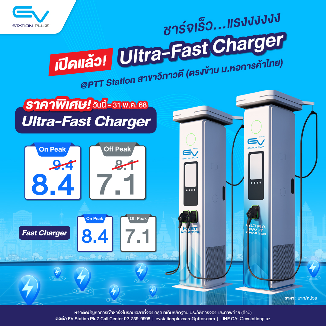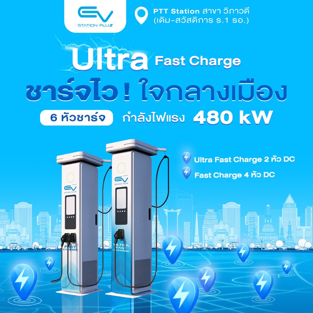 ทั้งนี้นวัตกรรม Ultra Fast Charge ช่วยให้ชาร์จรถยนต์ไฟฟ้าเร็วขึ้นด้วยเทคโนโลยี Liquid-Cooled ที่บริหารการจ่ายไฟอย่างมีประสิทธิภาพและระบายความร้อนในการชาร์จได้ดียิ่งขึ้น ตอบโจทย์รถยนต์ไฟฟ้าที่สามารถเรียกกำลังไฟได้สูงในพื้นที่มีความต้องการหนาแน่น โดยเปิดให้บริการที่ พีทีที สเตชั่น สาขาวิภาวดี (สวัสดิการ ร.1 รอ.) เป็นสาขาแรก มีทั้งหมด 4 แท่นชาร์จ รวม 6 หัวชาร์จ แบ่งเป็น Ultra Fast Charge จำนวน 2 แท่นชาร์จ (2 หัวชาร์จ DC CCS2) ที่สามารถจ่ายกำลังไฟแรงสุด 480 kW ต่อหัวชาร์จ ให้กระแสไฟ 425-500 A รองรับการชาร์จต่อเนื่องได้นาน 30 นาที และ Fast Charge อีก 2 แท่นชาร์จ (4 หัวชาร์จ DC CCS2) ที่มีกำลังไฟสูงสุด 480 kW ต่อหัวชาร์จ ให้กระแสไฟ 375-500 A รองรับการชาร์จต่อเนื่อง 10 นาที