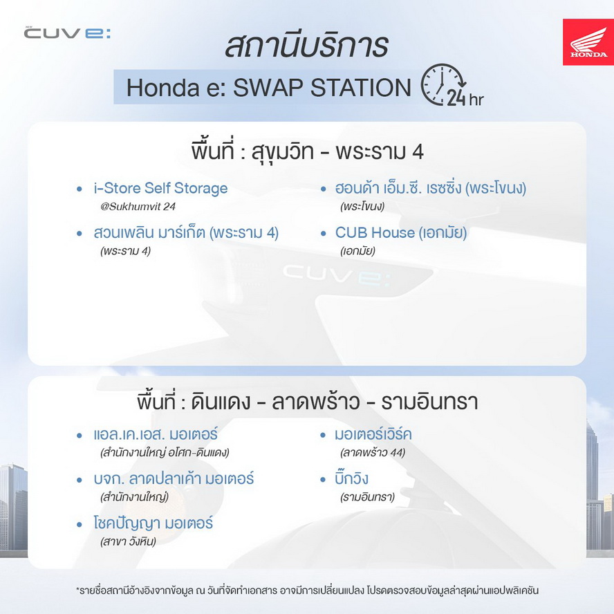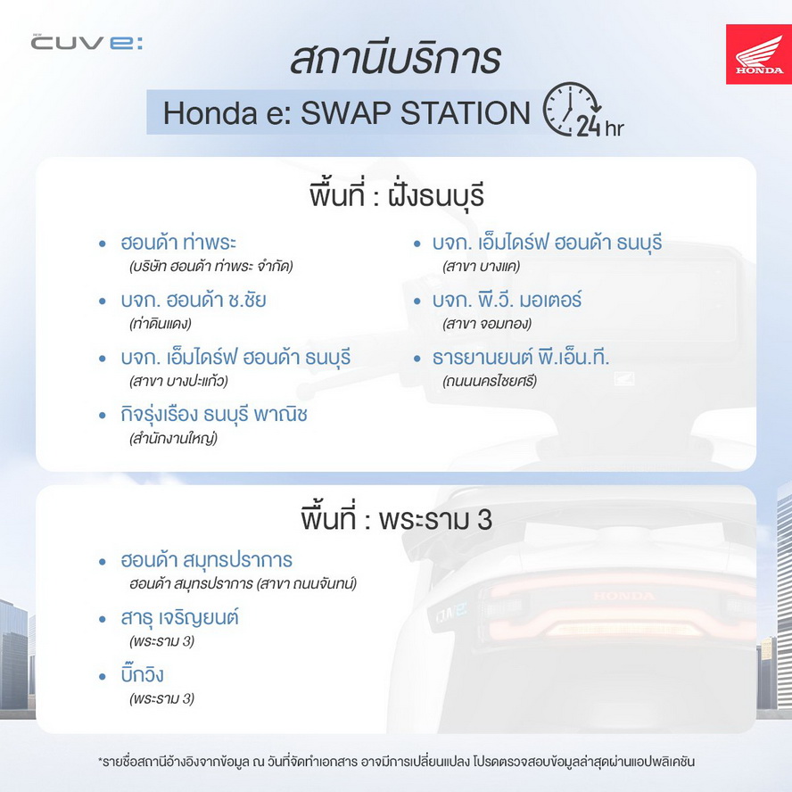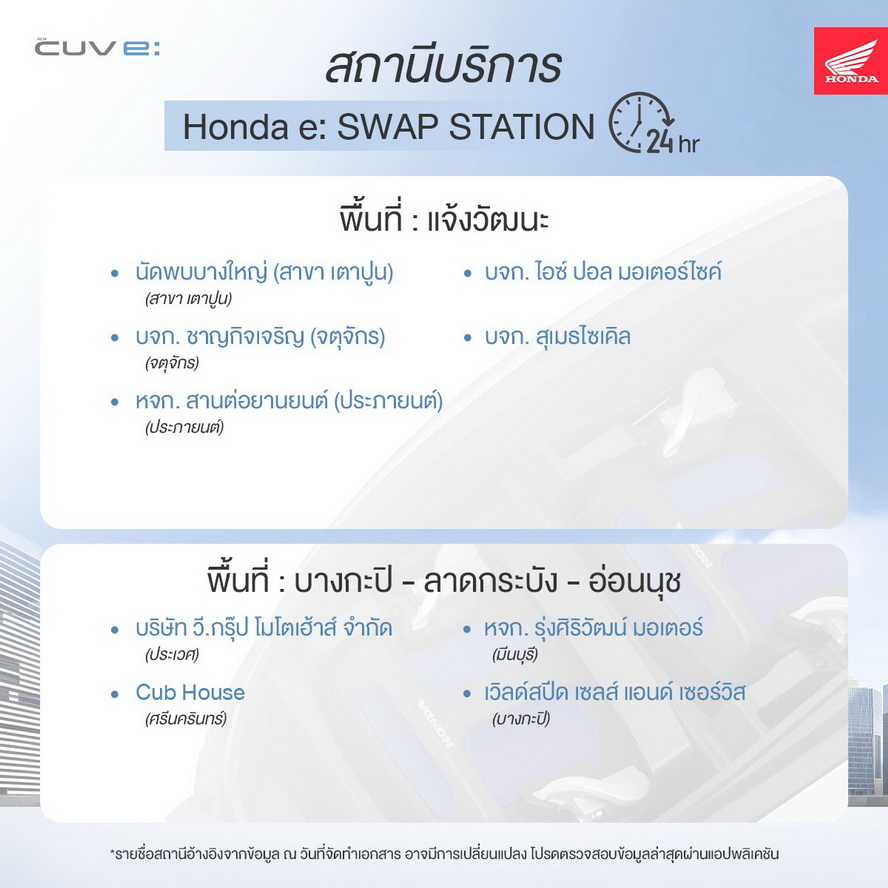 ไทยฮอนด้าเผยสถานีสับเปลี่ยนแบตเตอรี่รถมอเตอร์ไซค์ไฟฟ้า “Honda e: SWAP STATION” เปิดให้บริการแล้วกว่า 33 แห่งทั่วกรุงเทพฯและปริมณฑล สามารถสับเปลี่ยนได้ไวภายใน 1 นาที แค่ Scan - Swap - Start (แตะ สแกน สับเปลี่ยนแบตเตอรี่ลูกใหม่) แล้วไปต่อได้เลย ไม่ต้องเสียเวลารอนาน ให้บริการตลอด 24 ชั่วโมง