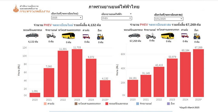 ส่วนยอดจดทะเบียนสะสมยานยนต์ไฟฟ้าประเภทไฟฟ้าผสมแบบเสียบปลั๊ก (PHEV) ณ วันที่ 31 มีนาคม 2568 มีจำนวน 67,269 คัน เป็นรถยนต์นั่งไฟฟ้าและกระบะไฟฟ้า PHEV ทั้งหมด