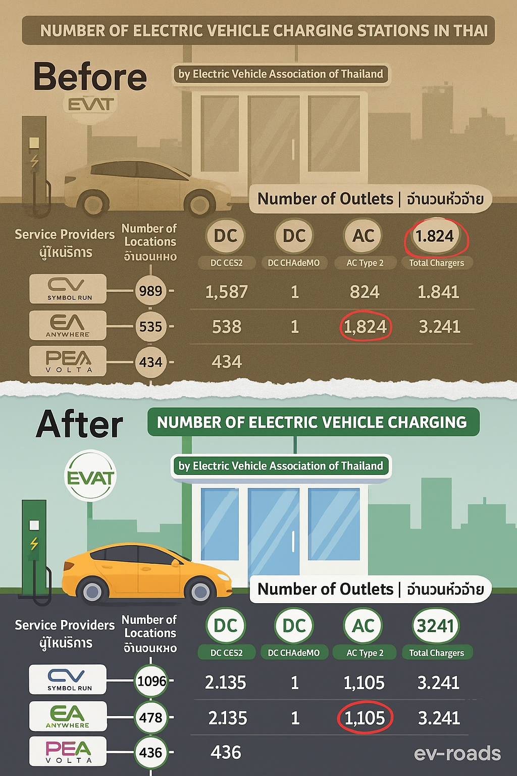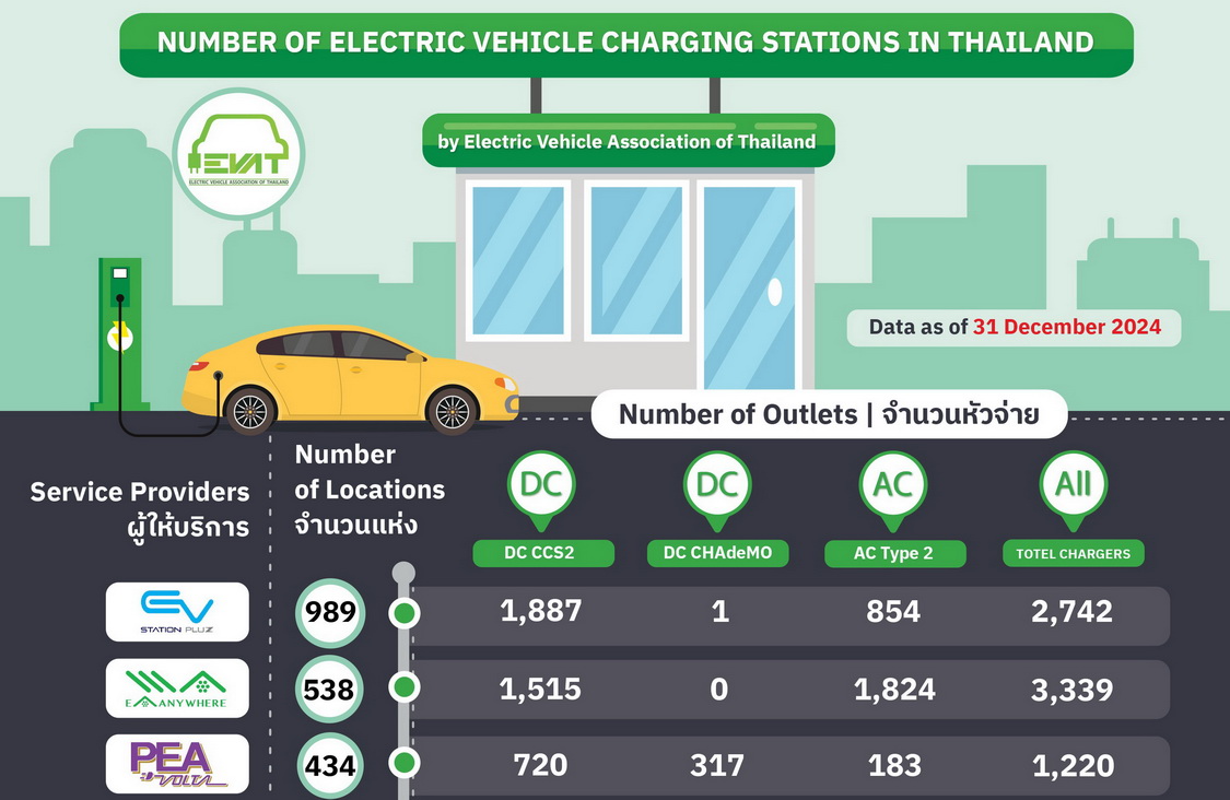 จากข้อมูลของสมาคมยานยนต์ไฟฟ้าไทย (EVAT) ที่บันทึกข้อมูลสถานีชาร์จยานยนต์ไฟฟ้าในไทยไว้ ณ วันที่ 31 ธันวาคม 2567 จากผู้ให้บริการสถานีชาร์จยานยนต์ไฟฟ้าทั้งหมด 19 แบรนด์ จะเห็นว่าค่าย EA ANYWHERE มีสถานีชาร์จสะสม 538 สถานี หัวชาร์จ DC CCS2 จำนวน 1,515 หัวชาร์จ หัวชาร์จ DC CHAdeMO จำนวน 0 หัวชาร์จ หัวชาร์จ AC Type2 จำนวน 1,824 หัวชาร์จ รวม 3,339 หัวชาร์จ อยู่ในอันดับที่ 2 รองจาก EV STATION PLUZ ของค่าย ปตท. เท่านั้น