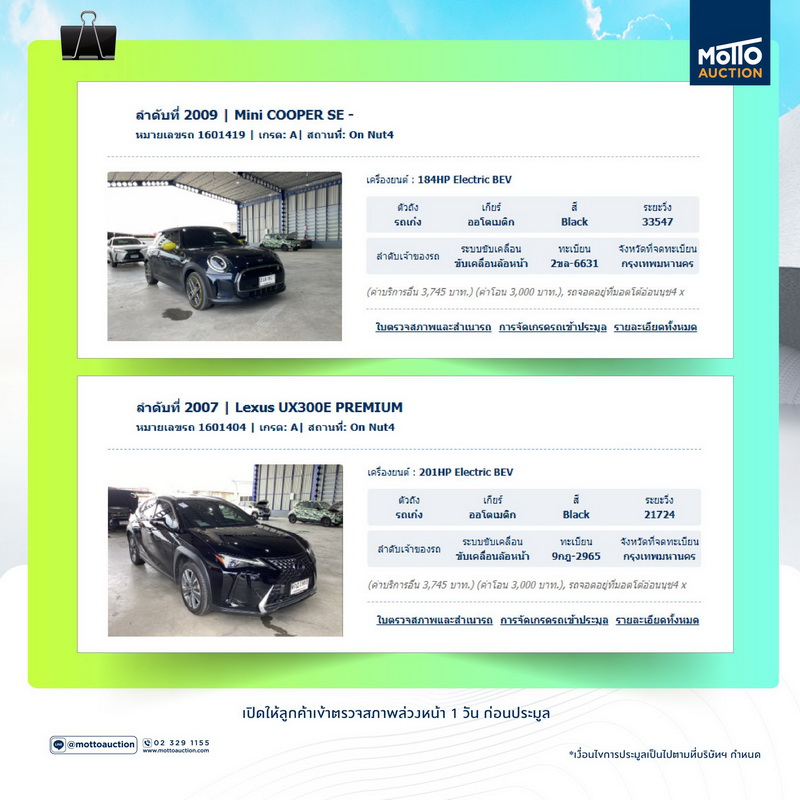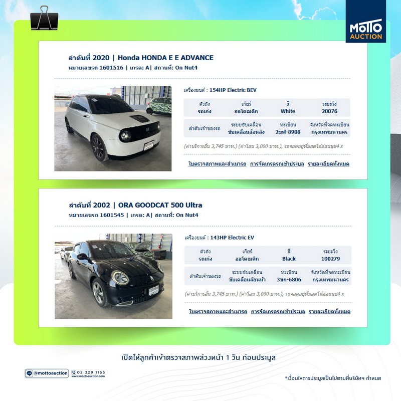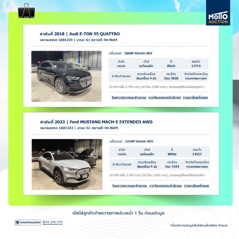 EVme จับมือกับ Motto Auction เปิดประมูลรถยนต์ไฟฟ้ามือสอง สภาพดี หลากหลายแบรนด์ รวมกว่า 30 คัน ไม่ว่าจะเป็น AUDI e-Tron 55 quattro , FORD MUSTANG MACH-E , MINI COOPER SE , HYUNDAI IONIQ 5 , HONDA e ฯลฯ วันพุธที่ 14 พฤษภาคม 2568 ที่ Motto Auction สาขากรุงเทพฯ มีประมูลทั้งออนไลน์และหน้าลาน รับทันที โค๊ดคูปอง ชาร์จไฟ มูลค่า 500 บาท