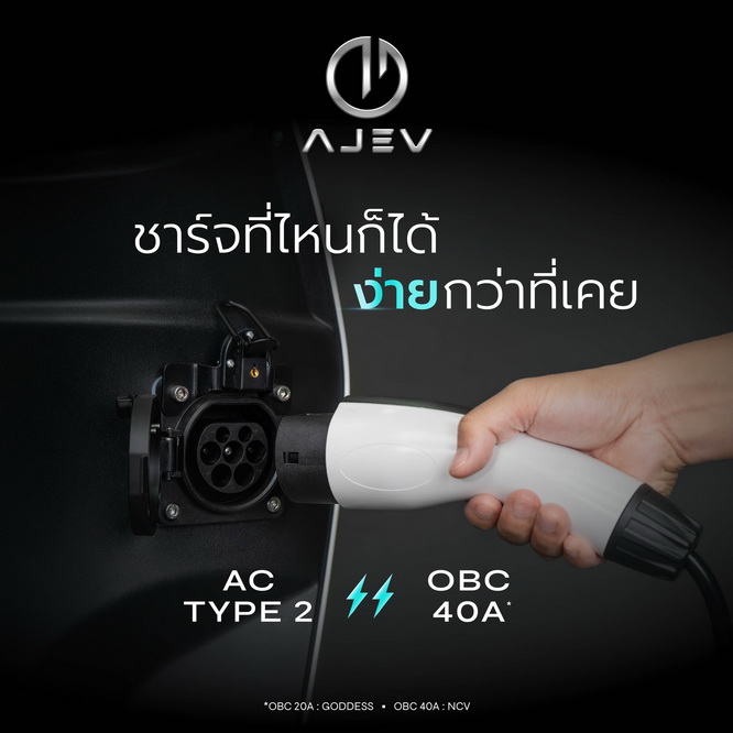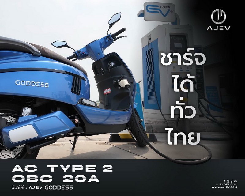 AJ EV ก้าวข้าม “จุดสลบ” ของรถมอเตอร์ไซค์ไฟฟ้ายุคนี้ ด้วยการส่ง GODDESS ที่มาพร้อมช่องชาร์จ AC TYPE2 (OBC 40A) ที่ทำให้สามารถชาร์จไฟได้จากทุกสถานีชาร์จรถยนต์ไฟฟ้ากว่า 5,000 จุดทั่วประเทศเช่นเดียวกับรถ EV โดยใช้เวลาชาร์จจาก 30-80% ในเวลา 41 นาที และวิ่งได้ไกล 150 กม./ชาร์จ