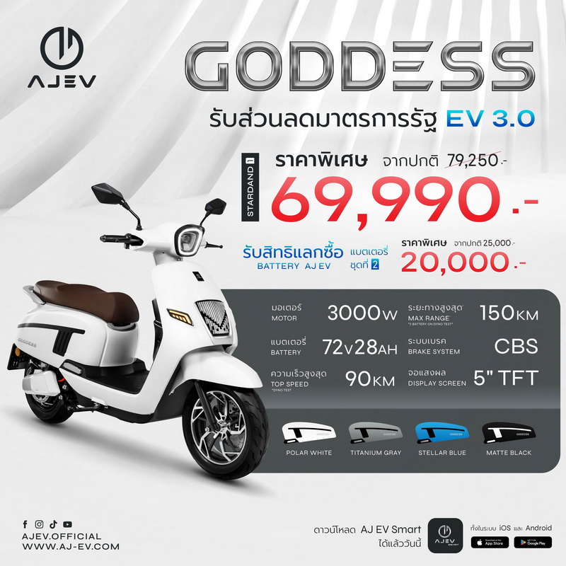 รถจักรยานยนต์ไฟฟ้า AJ EV GODDESS มีราคาเริ่มต้น 69,990 บาท ผ่อนเดือนละ 2,707 บาท* นานสูงสุด 36 เดือน* ดอกเบี้ย 1.07 %* รับประกันนานสูงสุด 5 ปี หรือ 50,000 กิโลฯ รับสิทธ์ซื้อเเบตเตอร์รี่ก้อนที่ 2 ในราคาพิเศษ เพียง 20,000 บาท จากปกติ 25,000 บาท
