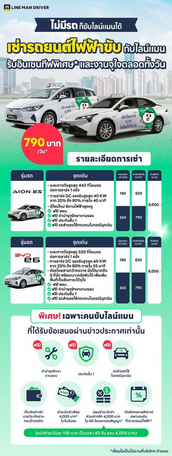LINE MAN ร่วมกับ Smart Taxi และ BYD ทำโปรเจ็คท์ให้เช่ารถแท็กซี่ไฟฟ้า BYD E6 พร้อมระบบแท็กซี่คุณภาพสูง ชูจุดเด่น ภายในกว้างขวาง จุผู้โดยสารได้ 5 ที่นั่ง มีพื้นที่ใส่สัมภาระด้านท้าย 580 ลิตร วิ่งได้ 502 กม./ชาร์จ ให้เช่าในราคาประหยัด เฉลี่ย 790 บาท/วัน (สัญญา 1 ปี) โดยต้องขับเต็มเวลากับไลน์แมน ส่งมอบรถ มิ.ย. 2568