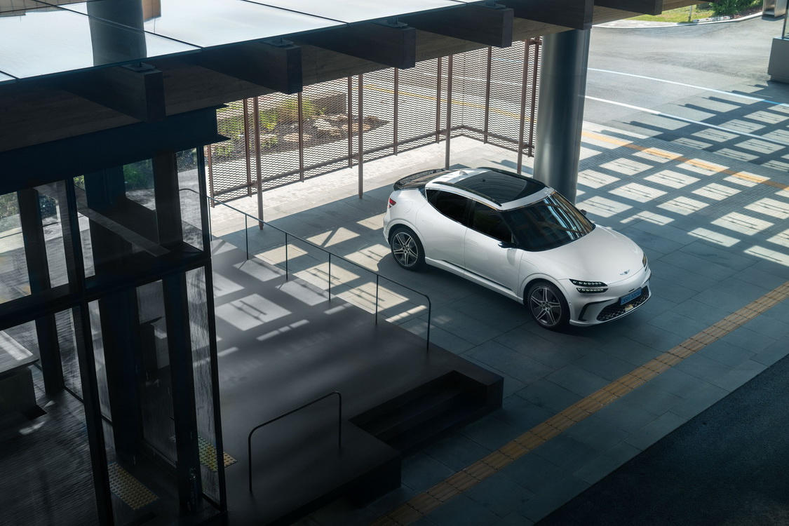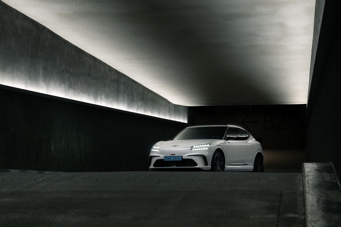 การออกแบบด้านหน้าสะกดสายตาด้วยกันชนหน้าที่ได้รับการออกแบบใหม่ให้มีรูปทรงสามมิติ ให้ความรู้สึกแข็งแกร่งและทันสมัย ไฟหน้าใช้เทคโนโลยี Micro Lens Array (MLA) ซึ่งเป็นครั้งแรกในรุ่น GV60 โดยยังคงเอกลักษณ์ "Two Lines" ที่เป็นสัญลักษณ์ของแบรนด์ Genesis