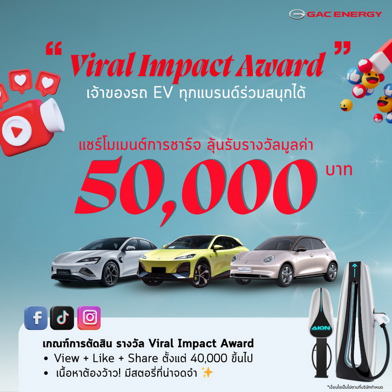 เงื่อนไข : ต้องได้ยอดรวม View + Like + Share ตั้งแต่ 40,000 ขึ้นไป ต้องเล่าประสบการณ์ "ชาร์จที่ GAC Energy" ให้น่าจดจำที่สุด