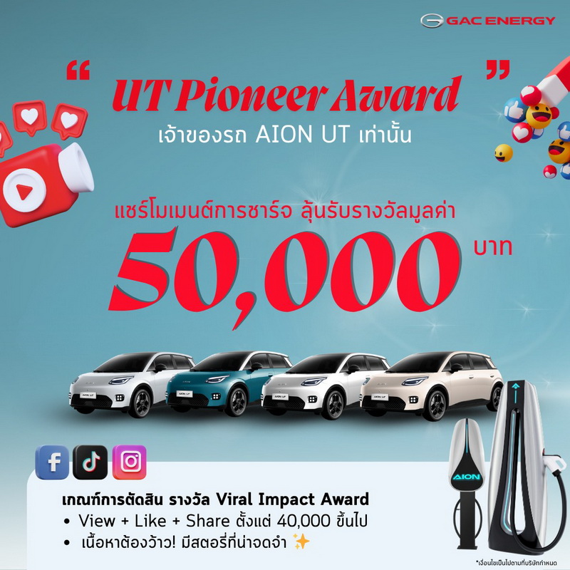 สถานีชาร์จ GAC Energy จัดแคมเปญ "GAC ON THE MOVE" ชวนแชร์โมเมนต์การชาร์จ ลุ้นรับรางวัลรวมกว่า 120,000 บาท เจ้าของรถ EV ทุกแบรนด์ร่วมเล่นได้ มีรางวัลพิเศษสำหรับผู้ใช้ AION UT หมดเขต 25 สิงหาคม 2568