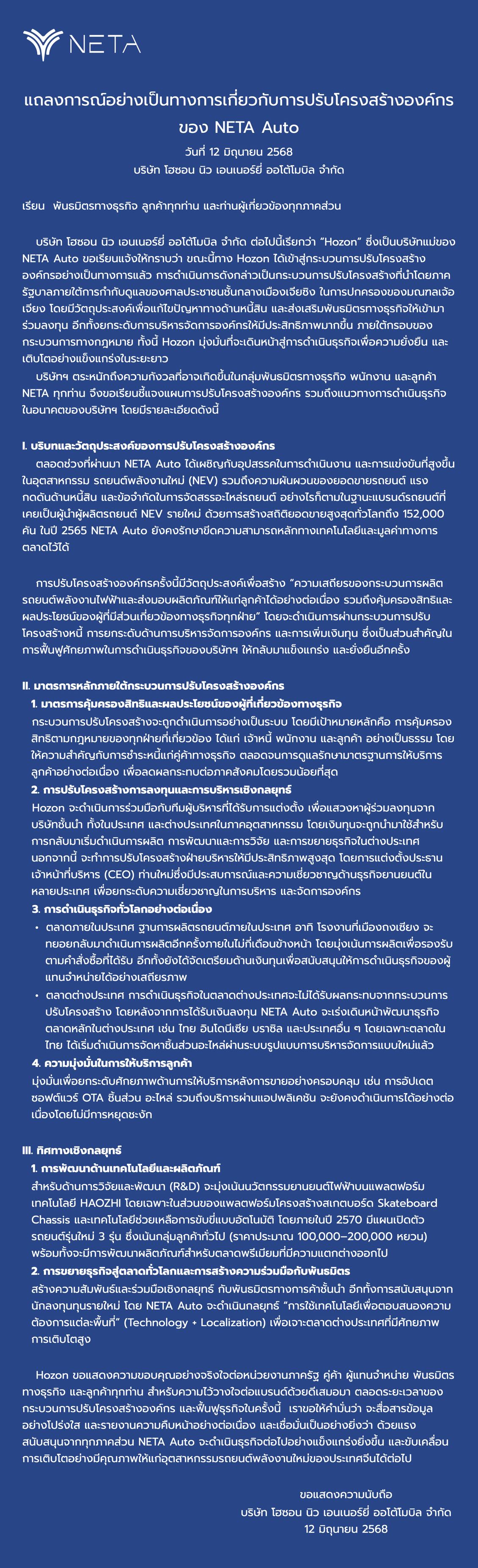 พร้อมกันนี้ ยังได้ยืนยันว่ากระบวนการดังกล่าวไม่มีผลกระทบต่อการดำเนินงานของ NETA Auto Thailand ซึ่งยังคงดำเนินธุรกิจในประเทศไทยตามปกติ โดยยังคงให้ความสำคัญกับการให้บริการลูกค้าและพัฒนาแบรนด์อย่างต่อเนื่อง พร้อมแนบแถลงการณ์อย่างเป็นทางการเกี่ยวกับการปรับโครงสร้างองค์กรของ บริษัท โฮซอน นิว เอนเนอร์ยี่ ออโต้โมบิล จำกัด มีรายละเอียดดังนี้