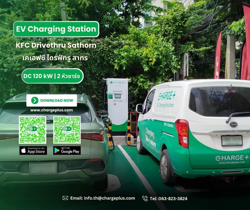 เมื่อเร็วๆนี้ Charge+ เปิดสถานีชาร์จที่ KFC Drivethrough Sathorn ติดตั้งเครื่องชาร์จ DC Fastcharge 120 kW 2 หัวชาร์จ เปิดบริการ 24 ชั่วโมง รอวงรับชาวออฟฟิศย่านสาทร-สีลม