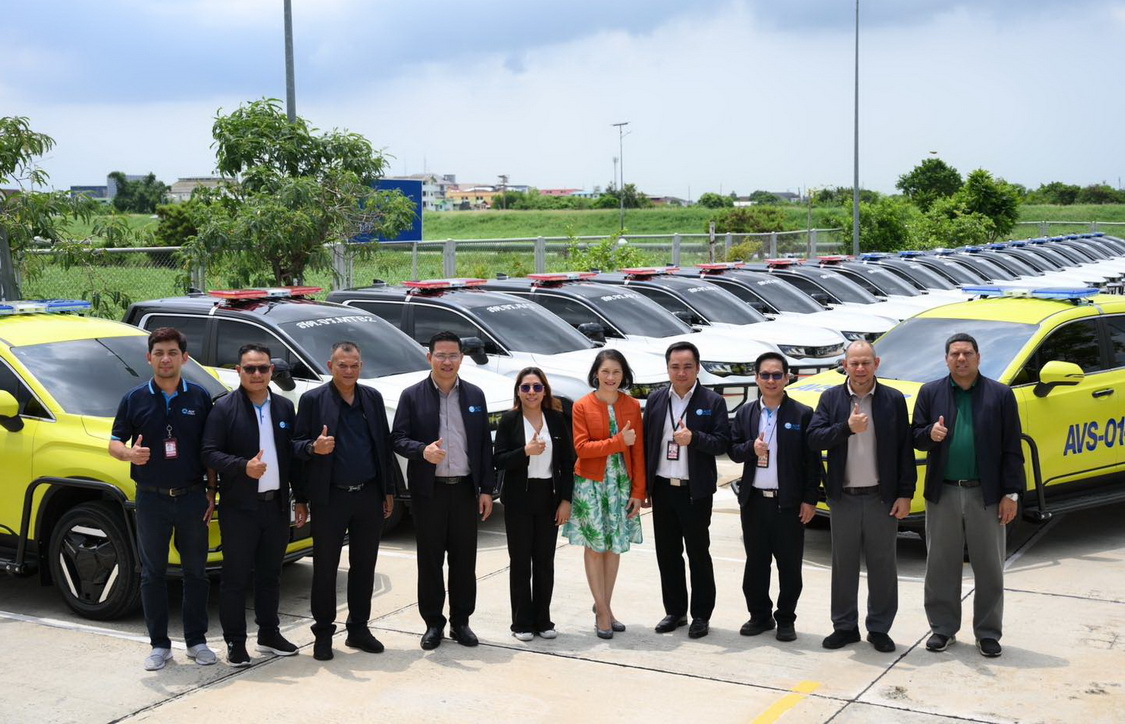 คุณสิริพร โฉมยงค์ รองกรรมการผู้จัดการสายงานทรัพยากรบุคคล บริษัท รักษาความปลอดภัย ท่าอากาศยานไทย จำกัด (AOT AVSEC) พร้อมด้วยคุณอำนาจ เอ็นดู ผู้จัดการฝ่ายปฏิบัติการท่าอากาศยานสุวรรณภูมิ และทีมงาน ฝสภ. ร่วมรับมอบรถกระบะไฟฟ้า RIDDARA รุ่น RIDDARA RD6 4WD จำนวน 21 คัน เพื่อใช้ในภารกิจลาดตระเวน รักษาความปลอดภัย พร้อมสนับสนุนการลดมลพิษ เน้นการใช้พลังงานที่เป็นมิตรต่อสิ่งแวดล้อม และไม่มีการปล่อยก๊าซคาร์บอนไดออกไซด์