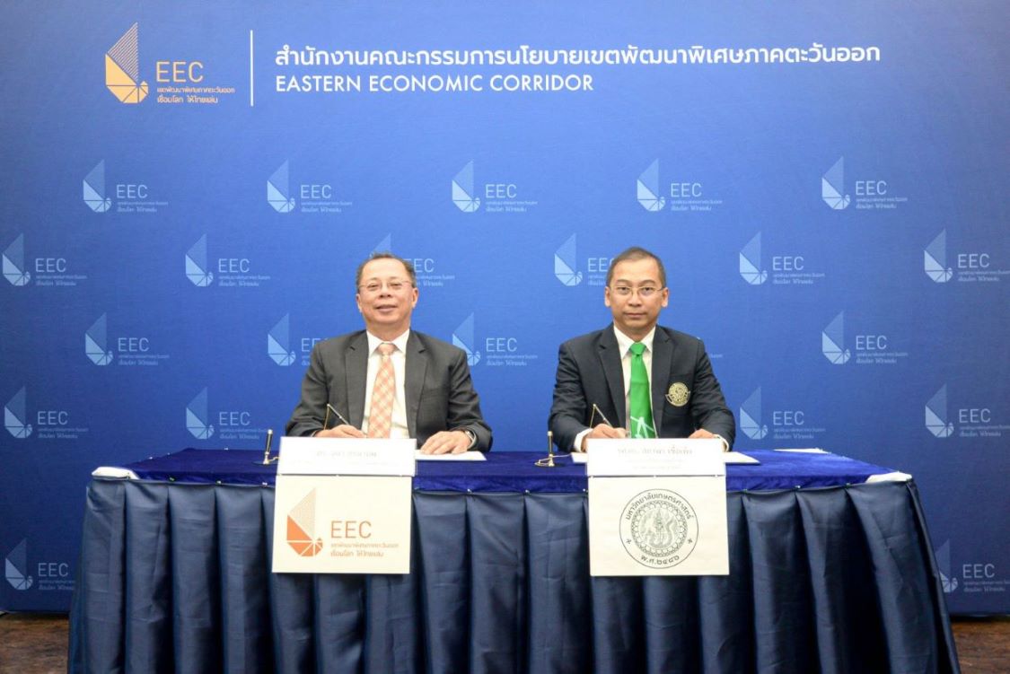 ดร.จุฬา สุขมานพ เลขาธิการคณะกรรมการนโยบายเขตพัฒนาพิเศษภาคตะวันออก (สกพอ.) และรองศาสตราจารย์ ดร. สถาพร เชื้อเพ็ง รองอธิการบดีวิทยาเขตศรีราชา มหาวิทยาลัยเกษตรศาสตร์ ร่วมกันลงนามในบันทึกข้อตกลงความร่วมมือ (MOU) เพื่อส่งเสริมการพัฒนาอุตสาหกรรม การพัฒนาบุคลากร การศึกษาในพื้นที่เขตพัฒนาพิเศษภาคตะวันออก (อีอีซี) และมีเป้าหมายสำคัญเพื่อเพิ่มขีดความสามารถในการแข่งขันของประเทศอย่างยั่งยืน โดยมีผู้บริหาร และเจ้าหน้าที่ที่เกี่ยวข้องจากทั้งสองหน่วยงานเข้าร่วม ณ สำนักงาน สกพอ. เมื่อเร็วๆ นี้