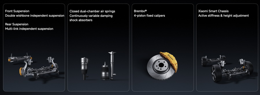 Xiaomi YU7 มาพร้อมระบบกันสะเทือนหน้าแบบอิสระปีกนกคู่ (Double Wishbone) และระบบกันสะเทือนหลังแบบอิสระ 5-link, ถุงลมแบบ Dual-Chamber Closed Air Springs + โช้คอัพปรับความหนืดต่อเนื่องประสิทธิภาพสูง, คาลิเปอร์เบรก Brembo® แบบ 4 พอต, Xiaomi Smart Chassis และอื่น ๆ อีกมากมาย แตกต่างจาก Xiaomi SU7 ที่เน้นความสปอร์ต Xiaomi YU7 สร้างสมดุลที่ละเอียดอ่อนระหว่างการควบคุมแบบไดนามิกและความสะดวกสบายที่หรูหรา ทุกรุ่นมาพร้อมกับ Xiaomi Smart Chassis เป็นมาตรฐาน ซึ่งมีระบบคาดการณ์สภาพถนนและการปรับช่วงล่างแบบเรียลไทม์ เมื่อตรวจพบเนินชะลอความเร็ว ระบบจะปรับความแข็งของช่วงล่างด้านหน้าและหลังโดยอัตโนมัติเพื่อการขับขี่ที่นุ่มนวลขึ้น เมื่อเข้าสู่ที่จอดรถใต้ดิน แชสซีที่ติดตั้งถุงลมสามารถปรับความสูงเพื่อลดความเสี่ยงจากการขูดใต้ท้องรถ ถุงลมแบบสองห้องสามารถปรับความสูงได้ถึง 40% พร้อมโช้คอัพที่ปรับความหนืดได้อย่างต่อเนื่องเพื่อการเปลี่ยนผ่านที่ราบรื่นระหว่างความรู้สึกสปอร์ตและความนุ่มนวล บนถนนที่ขรุขระ การควบคุมโช้คอัพอย่างต่อเนื่องของ Xiaomi YU7 ช่วยลดแรงสั่นสะเทือน ลดการโคลงของตัวถังในโค้งเพื่อความรู้สึกที่มั่นคงและสมดุล
