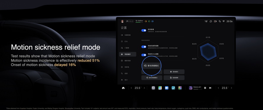 สำหรับผู้ที่เมารถง่าย เสียวหมี่ได้ร่วมมือกับโรงพยาบาล Huashan และโรงพยาบาล Beijing Tongren เพื่อร่วมกันพัฒนาโหมดลดอาการเมารถ (Motion Sickness Relief Mode) หลังจากการศึกษาอัตราการเต้นของหัวใจ การเคลื่อนไหวของดวงตา การนำไฟฟ้าของผิวหนัง และการตอบสนองอื่นๆ แชสซีของ Xiaomi YU7 ได้รับการปรับจูนอย่างแม่นยำเพื่อลดการโยนตัว การโคลง และการกระแทก อัตราเร่งให้ความรู้สึกมั่นคงเหมือนรถไฟความเร็วสูง การเบรกแบบสร้างพลังงาน (Regenerative Braking) ถูกปรับเทียบเพื่อลดอาการกระตุก และการโคลงของตัวถังจะลดลงอีกด้วยระบบกันสะเทือนแบบปรับได้ ในการทดสอบพบว่าโหมดนี้ช่วยลดอุบัติการณ์การเมารถได้ 51% และชะลอการเกิดอาการได้ 16%