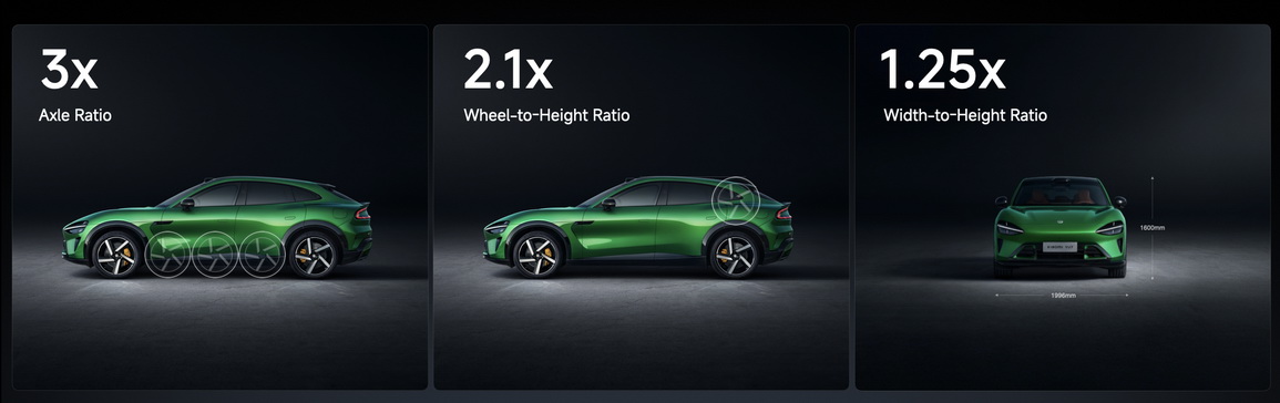 ภายนอกตัวรถมีอัตราส่วนระยะฐานล้อต่อความยาวตัวถัง 3:1 อัตราส่วนขนาดล้อต่อความสูงตัวรถ 2.1:1 และอัตราส่วนความกว้างต่อความสูงตัวรถ 1.25:1 ซึ่งเป็นพื้นฐานของรูปลักษณ์ที่น่าดึงดูด สัดส่วนที่สมดุลอย่างพิถีพิถันเหล่านี้ทำให้ Xiaomi YU7 มีทรวดทรงที่ดูลู่ลมและคลาสสิกตามแบบฉบับของรถ SUV สมรรถนะสูง อัตราส่วนด้านหน้าต่อตัวถังที่เพรียวบางเป็นพิเศษที่ 1:3 ช่วยยืดส่วนหน้าของรถให้ยาวขึ้น ทำให้ฝากระโปรงหน้าดูยาวและโดดเด่น ซึ่งเป็นเอกลักษณ์ของความหรูหราในวงการยานยนต์ที่สั่งสมมานานกว่าศตวรรษ ทั้งยังมอบพื้นที่ซับแรงกระแทกที่กว้างขวางเพื่อความปลอดภัยที่เพิ่มขึ้น โดยมีพื้นที่ดูดซับแรงกระแทกด้านหน้ายาวถึง 659 มม. ยกระดับมาตรฐานความปลอดภัยให้สูงขึ้น ด้วยดีไซน์ตัวถังที่กว้างและรูปทรงด้านหลังที่บึกบึน Xiaomi YU7 จึงสื่อถึงความเป็นสปอร์ตอย่างชัดเจน