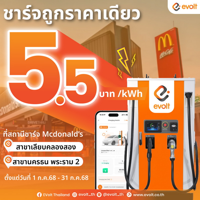 Evolt จัดโปรฯลดค่าชาร์จเหลือ 5.5 บาท/kWh ที่สถานีชาร์จ EVOLT x McDonald’s สาขาเลียบคลองสอง และสาขานครธน พระราม 2 ตั้งแต่วันที่ 1 ก.ค. 2568 - 31 ก.ค. 2568 จะชาร์จตอนกินเบอร์เกอร์ หรือเติมระหว่างขับกลับบ้านก็คุ้ม!