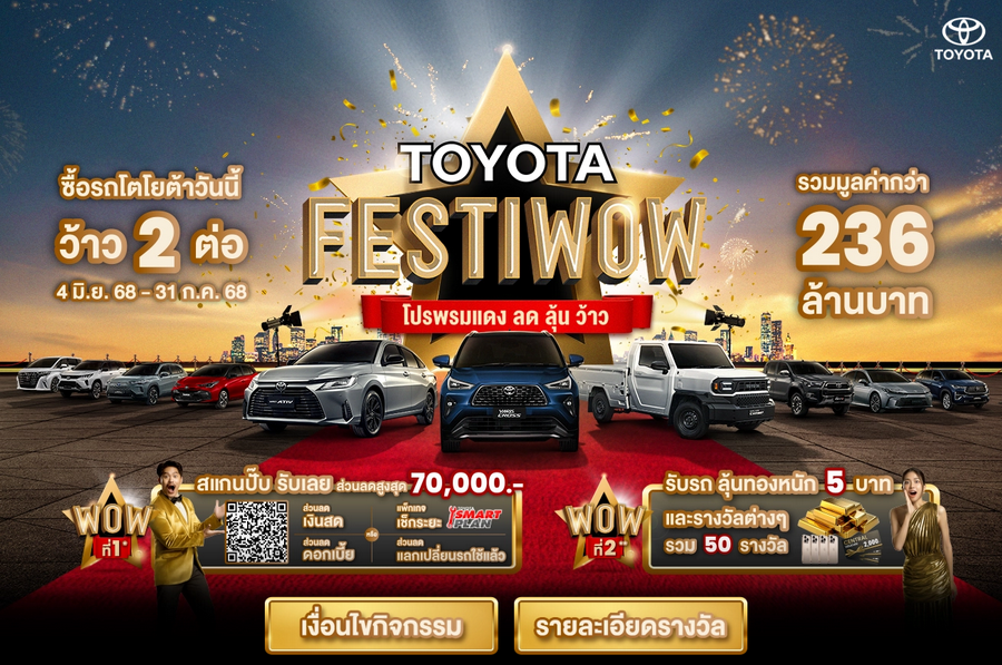 เลือกเป็นเจ้าของรถยนต์โตโยต้าไฮบริดยอดนิยมหลากหลายรุ่น พร้อมรับ “ข้อเสนอเร้าใจ FAST สุดทุกดีล” ได้ในงาน “FAST AUTO SHOW THAILAND 2025” ระหว่างวันที่ 2-6 กรกฎาคม 2568 ณ บูธ A1 ฮอลล์ EH 102-103 ไบเทค บางนา และที่ผู้แทนจำหน่ายโตโยต้าทั่วประเทศ