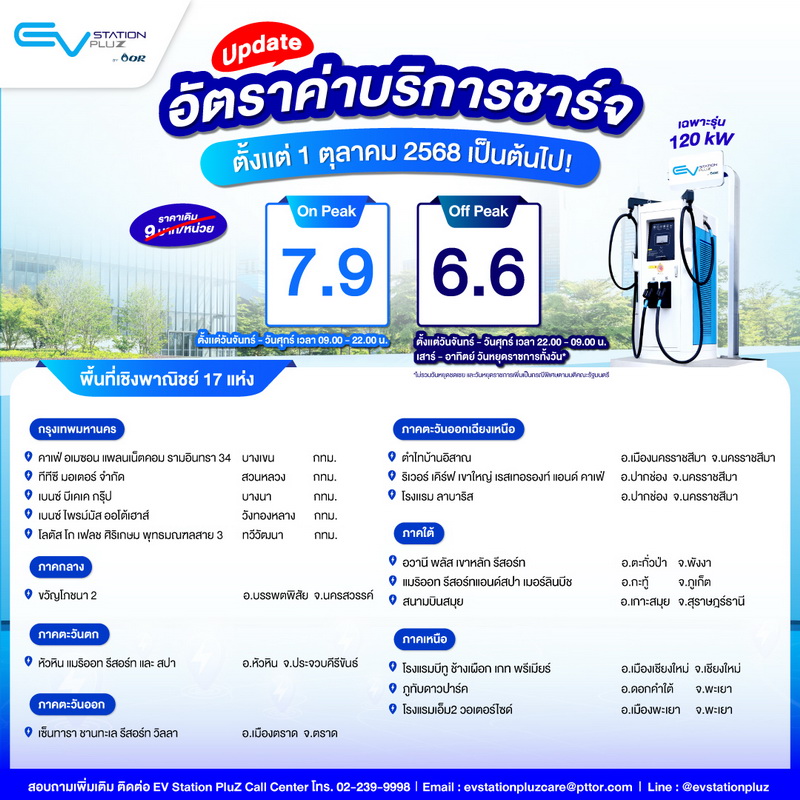 EV Station PluZ อัปเดตค่าบริการชาร์จในพื้นที่เชิงพาณิชย์ 17 แห่ง (เฉพาะตู้ชาร์จรุ่น 120 kW) จากเดิม 9 บาท/หน่วย On Peak ลดเหลือ 7.9 บาท/หน่วย ช่วง Off Peak ลดเหลือ 6.6 บาท/หน่วย ตั้งแต่วันที่ 1 ต.ค. 2568 เป็นต้นไป