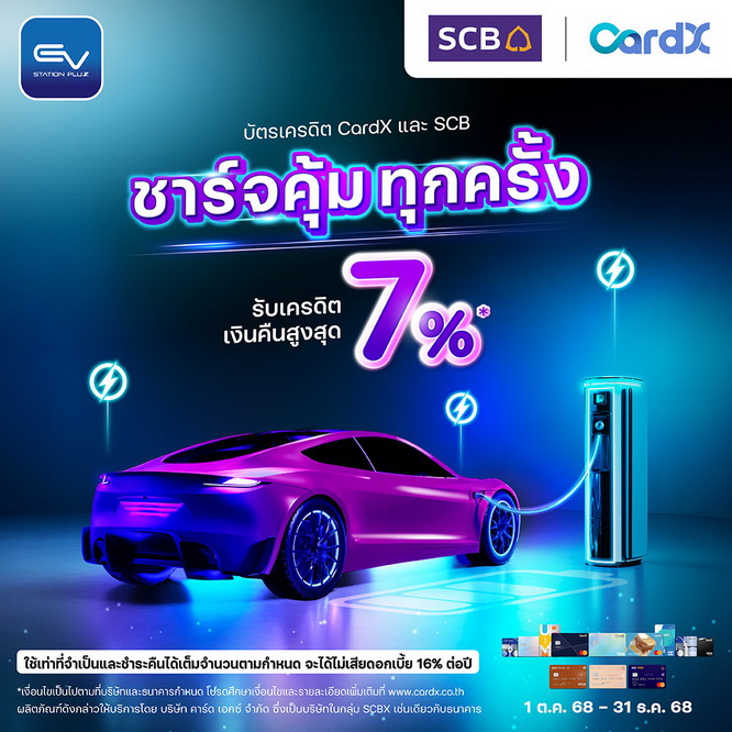 นอกจากนี้ EV Station PluZ ยังจับมือกับบัตรเครดิต CardX และ SCB จัดโปรฯรับเครดิตเงินคืนสูงสุด 7%* สูงสุด 735 บาท/คน ตลอดระยะเวลารายการส่งเสริมการขาย เมื่อมียอดใช้จ่ายสะสมตามเงื่อนไขกำหนด สำหรับผู้ใช้บัตรเครดิต CardX และ SCB ตั้งแต่ 1 ต.ค. 2568 – 31 ธ.ค. 2568 (ใช้เท่าที่จำเป็นและชำระคืนได้เต็มจำนวนตามกำหนด จะได้ไม่เสียดอกเบี้ย 16% ต่อปี) ดูรายละเอียดเพิ่มเติมที่ www.cardx.co.th