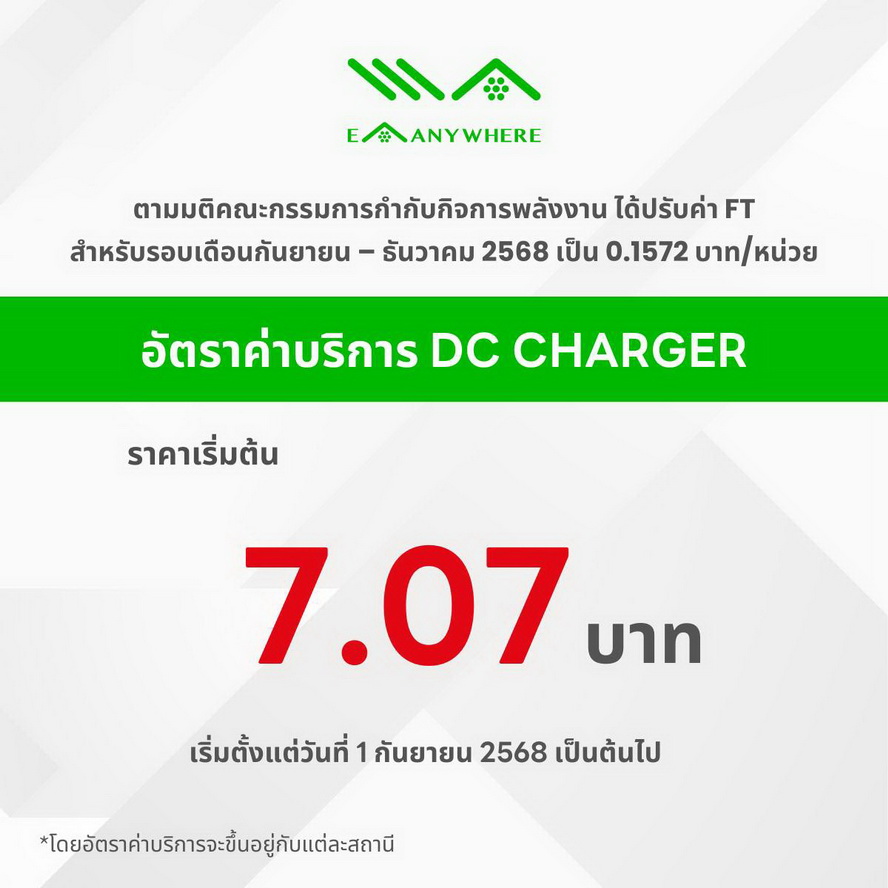 อัตราค่าชาร์จ DC Charger เริ่มต้น 7.07 บาท/หน่วย