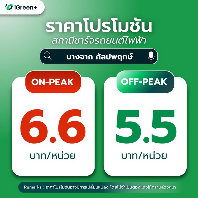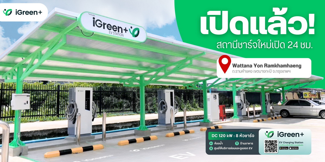 iGreen+ เปิดสถานีชาร์จ EV ใหม่ 4 แห่ง พร้อมหัวชาร์จ DC Fast Charge 120 kW 6 ช่องจอด 6-8 หัวชาร์จ จัดโปรฯค่าชาร์จ ช่วง On-Peak 6.6 บาท/หน่วย | Off-Peak 5.5 บาท/หน่วย โดยมีสถานีเครือข่ายเข้าร่วมรายการ ดังนี้