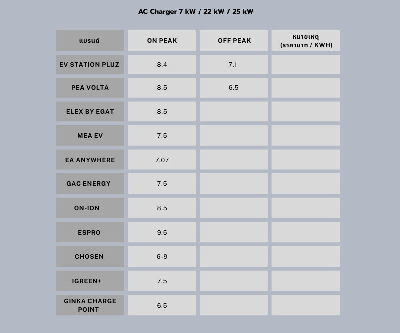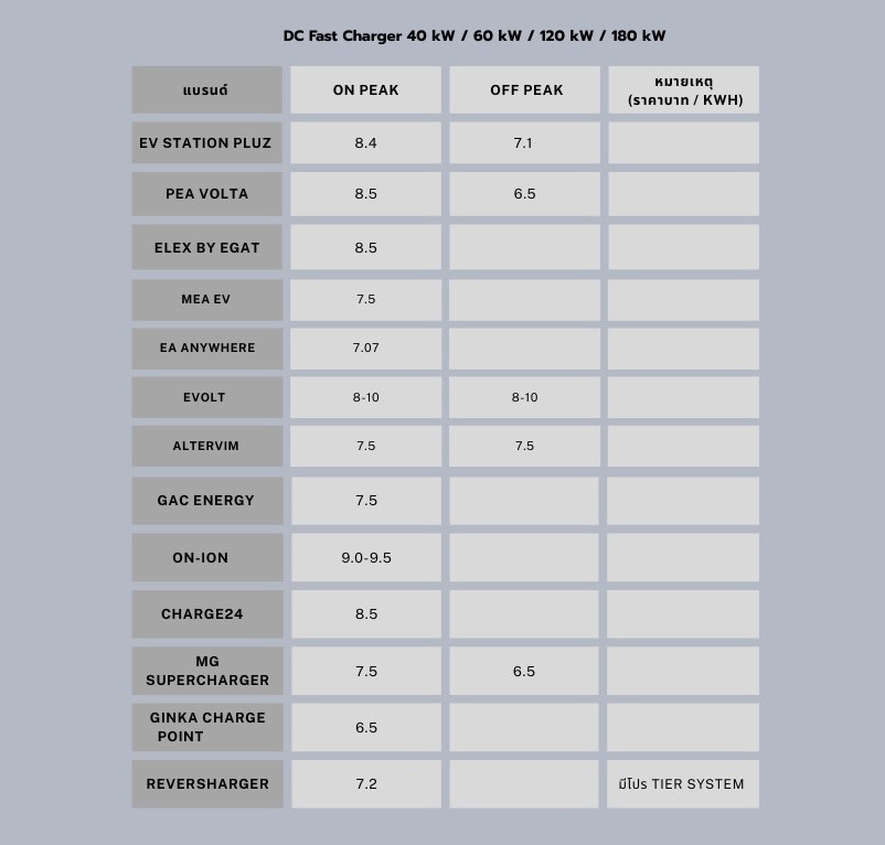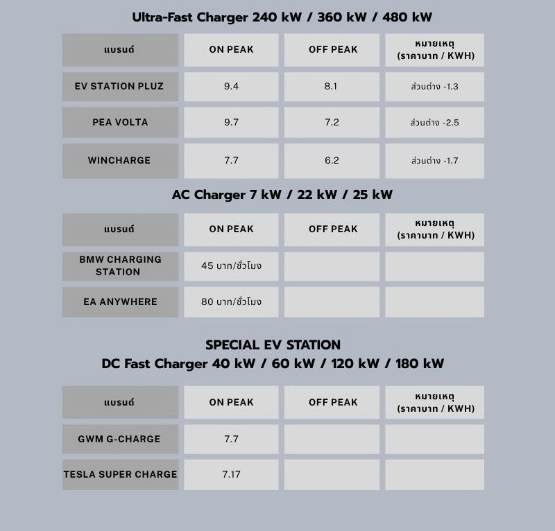 เว็บไซต์ ev-roads รวบรวมอัตราค่าชาร์จของสถานีชาร์จในประเทศไทย โดยแยกประเภทอัตราค่าชาร์จ EV ออกเป็น