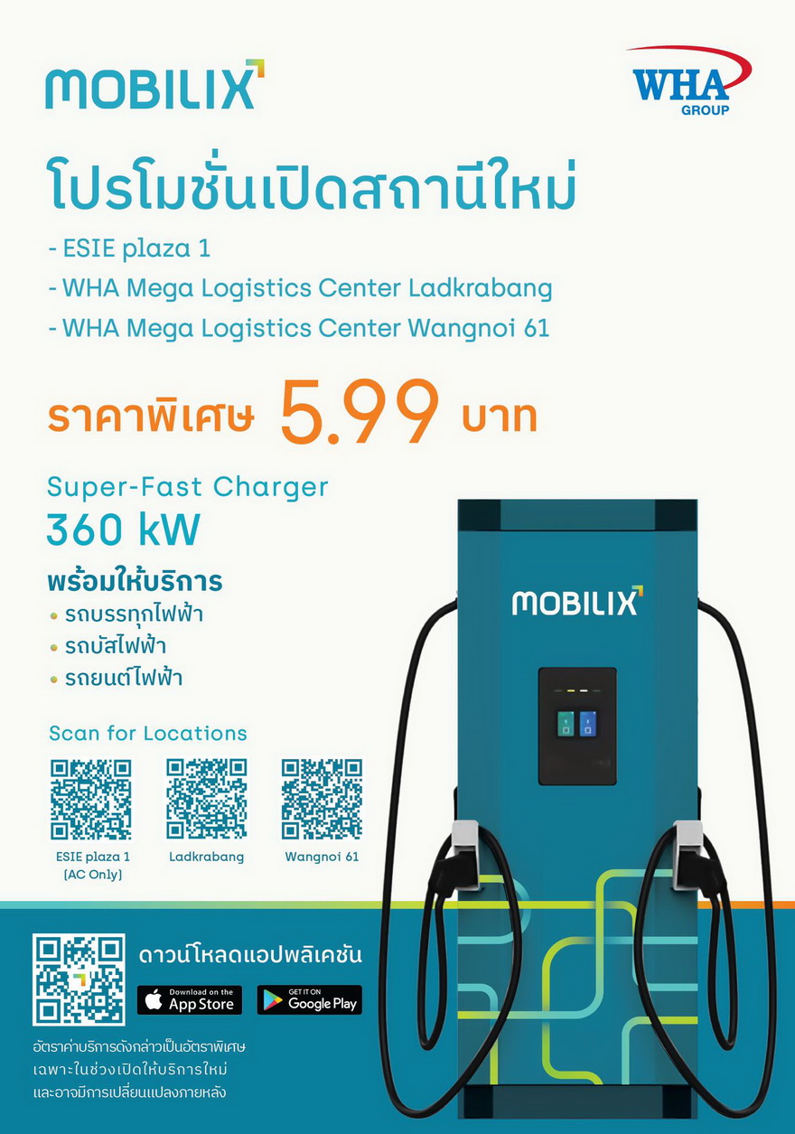 Mobilix จัดโปรโมชั่นฉลองเปิดสถานีชาร์จใหม่ให้ชาร์จ EV คันเก่งในราคาพิเศษ เพียง 5.99 บาท/หน่วย ให้บริการด้วยเครื่องชาร์จ Super-Fast Charger 360 kW รองรับรถไฟฟ้าทุกรูปแบบ