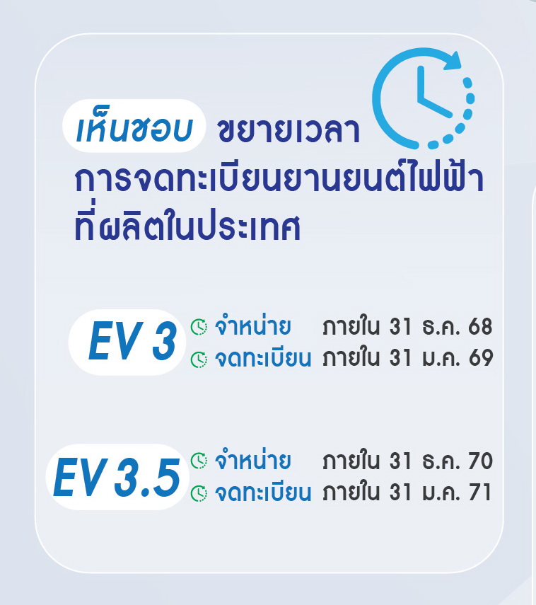 นอกจากนี้ เพื่อให้สอดคล้องกับกระบวนการจดทะเบียนยานยนต์ที่จำหน่ายในช่วงเวลาสิ้นปี บอร์ดอีวีได้เห็นชอบให้กรมสรรพสามิตขยายเวลาการจดทะเบียนยานยนต์ไฟฟ้าที่ผลิตในประเทศ ภายใต้มาตรการ EV3 และ EV3.5 ออกไปอีก 1 เดือน จากเดิมมาตรการ EV3 ให้จดทะเบียนภายในวันที่ 31 ธันวาคม 2568 เป็น “จำหน่ายภายในวันที่ 31 ธันวาคม 2568 และจดทะเบียนภายในวันที่ 31 มกราคม 2569” และมาตรการ EV3.5 จากเดิมให้จดทะเบียนภายในวันที่ 31 ธันวาคม 2570 เป็น “จำหน่ายภายในวันที่ 31 ธันวาคม 2570 และจดทะเบียนภายในวันที่ 31 มกราคม 2571”