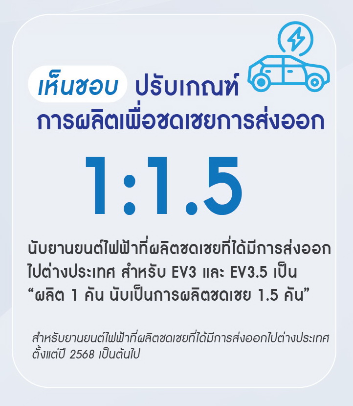 นายนฤตม์ เทอดสถีรศักดิ์ เลขาธิการคณะกรรมการส่งเสริมการลงทุน (บีโอไอ) ในฐานะกรรมการและเลขานุการ คณะกรรมการนโยบายยานยนต์ไฟฟ้าแห่งชาติ (บอร์ดอีวี) เปิดเผยว่า เมื่อวันที่ 30 กรกฎาคม 2568 ที่ประชุมบอร์ดอีวี ซึ่งมีนายพิชัย ชุณหวชิร รองนายกรัฐมนตรีและรัฐมนตรีว่าการกระทรวงการคลัง เป็นประธาน ได้เห็นชอบให้กรมสรรพสามิต ปรับเงื่อนไขในการคำนวณจำนวนยานยนต์ไฟฟ้าที่ผลิตชดเชยภายใต้มาตรการ EV3 และ EV3.5 โดยให้ “ผลิต 1 คัน นับเป็นการผลิตชดเชย 1.5 คัน” สำหรับยานยนต์ที่ผลิตและส่งออกไปต่างประเทศ ตั้งแต่ปี 2568 ตามข้อเสนอของสภาอุตสาหกรรมแห่งประเทศไทยและสมาคมยานยนต์ไฟฟ้าไทย ซึ่งแนวทางดังกล่าวจะช่วยสร้างแรงจูงใจให้ผู้ผลิตยานยนต์ไฟฟ้าขยายตลาดส่งออก โดยคาดว่าจะทำให้จำนวนการส่งออกยานยนต์ไฟฟ้าเพิ่มขึ้นเป็นประมาณปีละ 12,500 คัน ในปี 2568 และ 52,000 คัน ในปี 2569