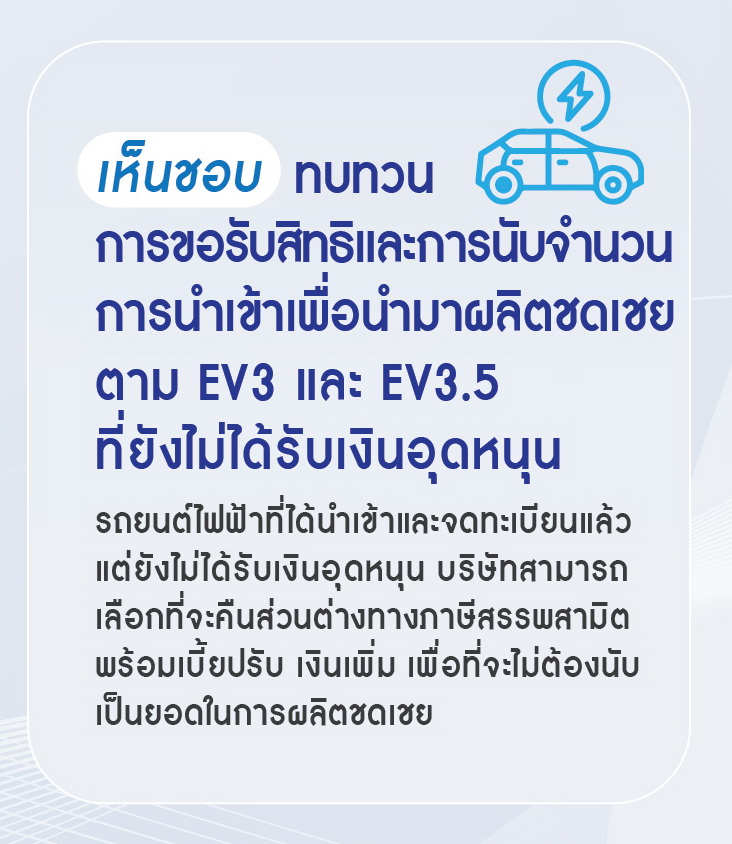 ให้ผู้เข้าร่วมมาตรการ EV3 และ EV3.5 สามารถทบทวนการขอรับสิทธิและการนับจำนวนการนำเข้าเพื่อการผลิตชดเชยได้ โดยรถยนต์ไฟฟ้าที่ได้นำเข้าและจดทะเบียนแล้ว แต่ยังไม่ได้รับเงินอุดหนุน บริษัทสามารถเลือกที่จะคืนส่วนต่างทางภาษีสรรพสามิต พร้อมเบี้ยปรับ เงินเพิ่ม เพื่อที่จะ ไม่ต้องนับเป็นยอดในการผลิตชดเชย