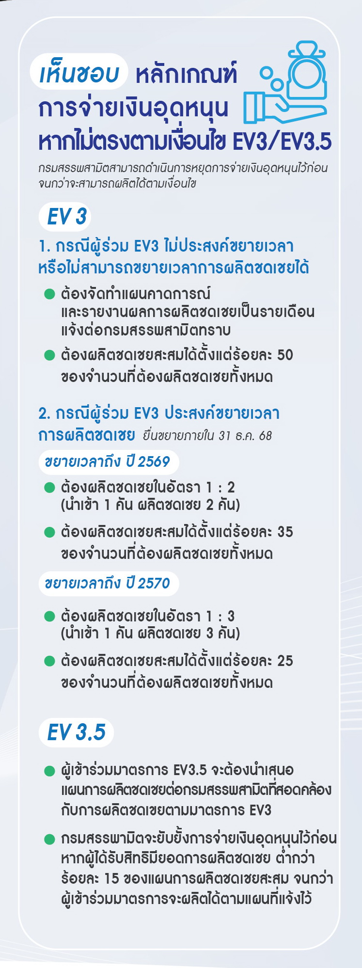 สำหรับผู้เข้าร่วมมาตรการ EV3 ที่ไม่ขยายเวลาผลิตชดเชย ให้จัดทำแผนคาดการณ์การผลิตชดเชย และรายงานผลการผลิตชดเชยเป็นรายเดือน โดยกรมสรรพสามิตจะยับยั้งการจ่ายเงินอุดหนุนจนกว่าจะผลิตชดเชยสะสมได้ตั้งแต่ร้อยละ 50 ของจำนวนที่ต้องผลิตชดเชยทั้งหมด และผลิตได้ตาม แผนคาดการณ์ ในกรณีผู้เข้าร่วมมาตรการ EV3 ที่จะขยายเวลาผลิตชดเชยหรือผู้เข้าร่วมมาตรการ EV3.5 จะต้องจัดทำแผนคาดการณ์การผลิตชดเชย โดยผู้เข้าร่วมมาตรการ EV3 ที่ขยายเวลา ต้องวาง Bank Guarantee 20 ล้านบาท สำหรับบริษัทที่มีทุนจดทะเบียน 5,000 ล้านบาท ขึ้นไป และ 40 ล้านบาท สำหรับบริษัทที่มีทุนจดทะเบียนต่ำกว่า 5,000 ล้านบาท โดยกรมสรรพสามิต จะยับยั้งการจ่ายเงินอุดหนุน หากผู้ได้รับสิทธิมียอดการผลิตชดเชยสะสมต่ำกว่าสัดส่วนที่กำหนด