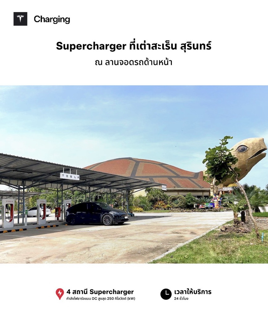 30.สถานี Tesla Supercharger ณ ศูนย์รวมของฝาก เต่าสะเร็น จ.สุรินทร์ บริเวณลานจอดรถด้านหน้า ติดตั้งเครื่องชาร์จแบบ DC ชาร์จเร็ว/แรงสูงสุด 250 กิโลวัตต์ (kW) จำนวน 4 เครื่อง 4 ช่องชาร์จ เปิดให้บริการ 24 ชั่วโมง