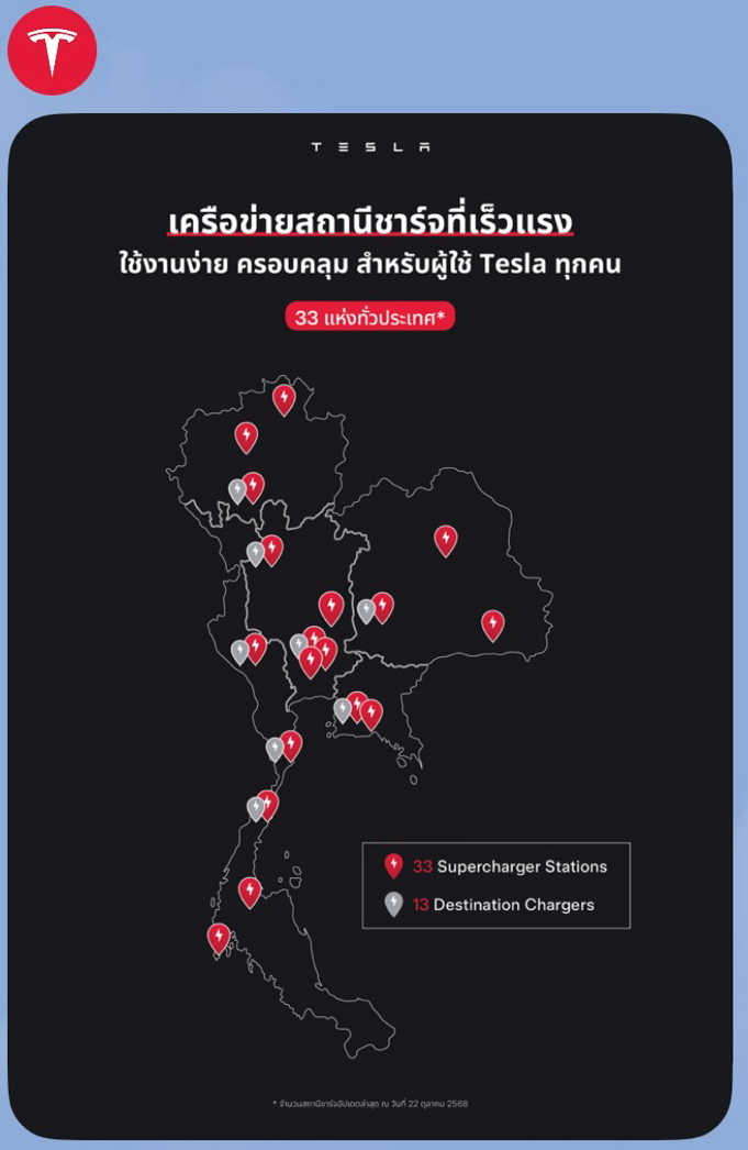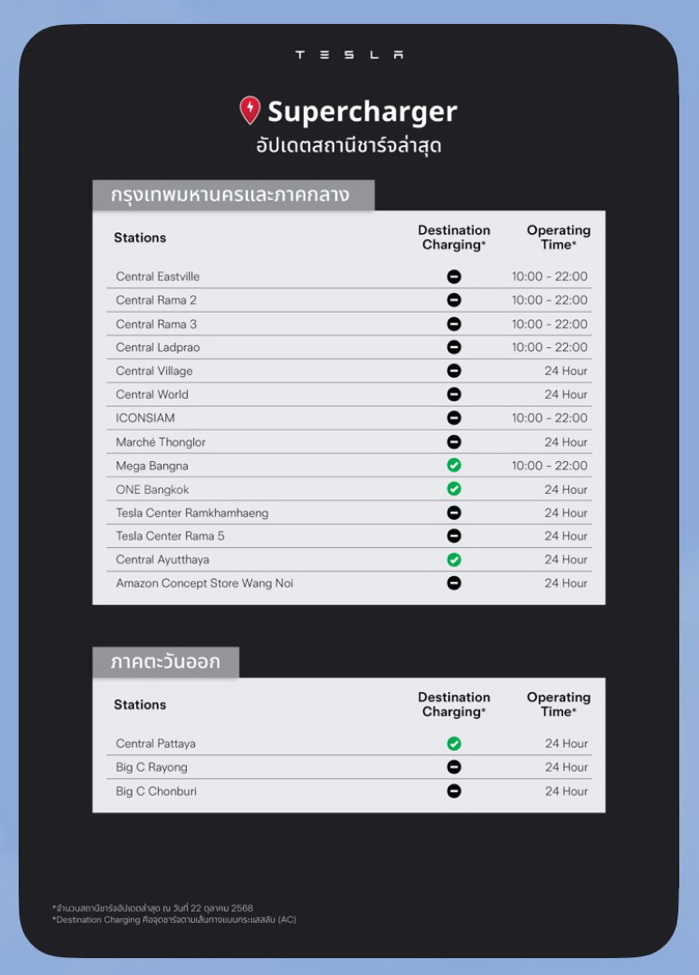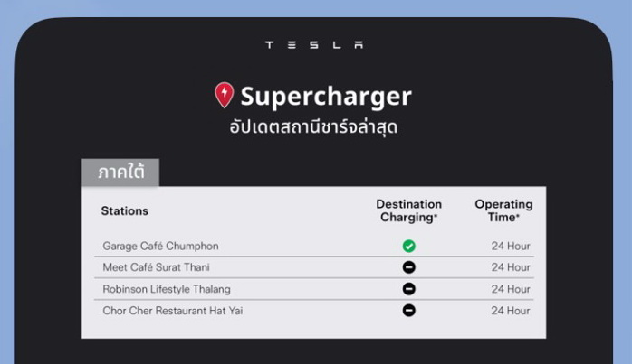 พิกัดสถานี Tesla Supercharger ที่เปิดให้บริการในประเทศไทยทั้ง 31 จุด 188 หัวชาร์จ