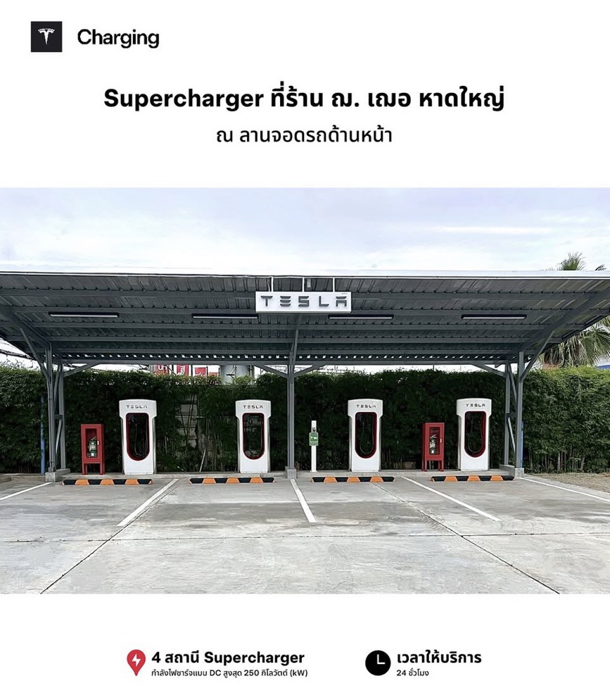 เทสลา ประเทศไทย เปิดสถานี Tesla Supercharger แห่งใหม่ล่าสุดที่ร้าน ฌ. เฌอ หาดใหญ่ บริเวณลานจอดรถด้านหน้า ติดตั้งเครื่องชาร์จแบบ DC ชาร์จเร็ว/แรงสูงสุด 250 กิโลวัตต์ (kW) จำนวน 4 เครื่อง 4 ช่องชาร์จ ค่าบริการนาทีละ 7.17 บาท เปิดให้บริการ 24 ชั่วโมง พิกัด : ถนนเลี่ยงเมืองติดกับ 3K homebase สายเอเชีย โทร. 093-1566465 / 083-1195222  นับเป็นสถานี Supercharger ลำดับที่ 32 ของเทสลา ในไทย