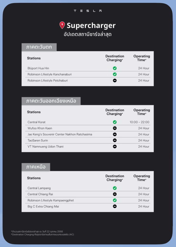 20.สถานี TESLA SUPERCHARGE เชียงราย  พิกัดหน้าห้างเซ็นทรัล เชียงราย เลขที่ 99/9 ถ.พหลโยธิน จ.เชียงราย ติดตั้งเครื่องชาร์จ 4 Supercharger กำลังสูงสุด 250kW รองรับระบบชาร์จ CCS จำนวน 4 เครื่อง เปิดให้บริการทุกวัน ตลอด 24 ชั่วโมง