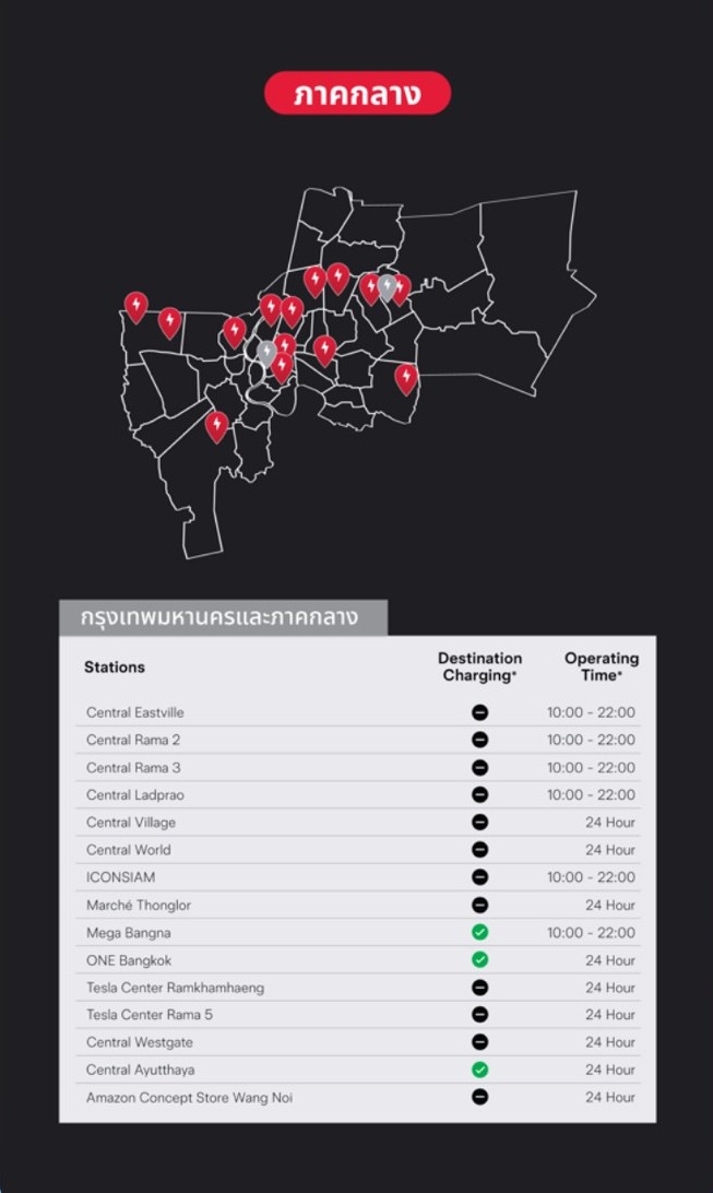 1.สถานี Tesla Supercharge ห้างสรรพสินค้าเซ็นทรัลเวิลด์ จำนวน 9 หัวชาร์จ บริเวณลานจอดรถชั้นใต้ดิน 2 ล็อค F 36-F38 และ G36-G37