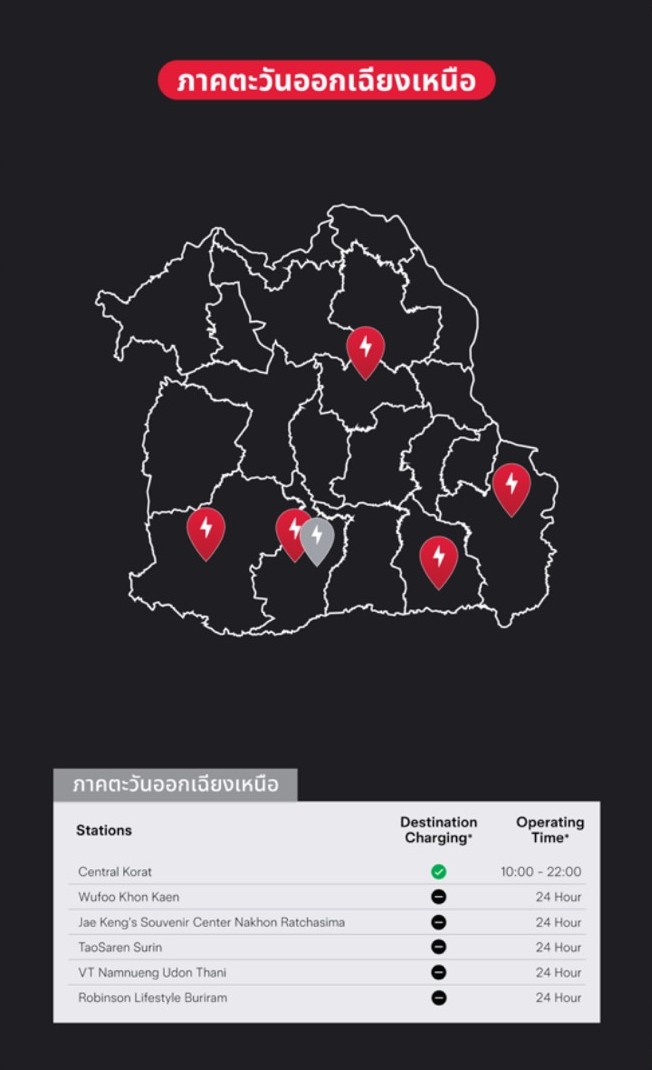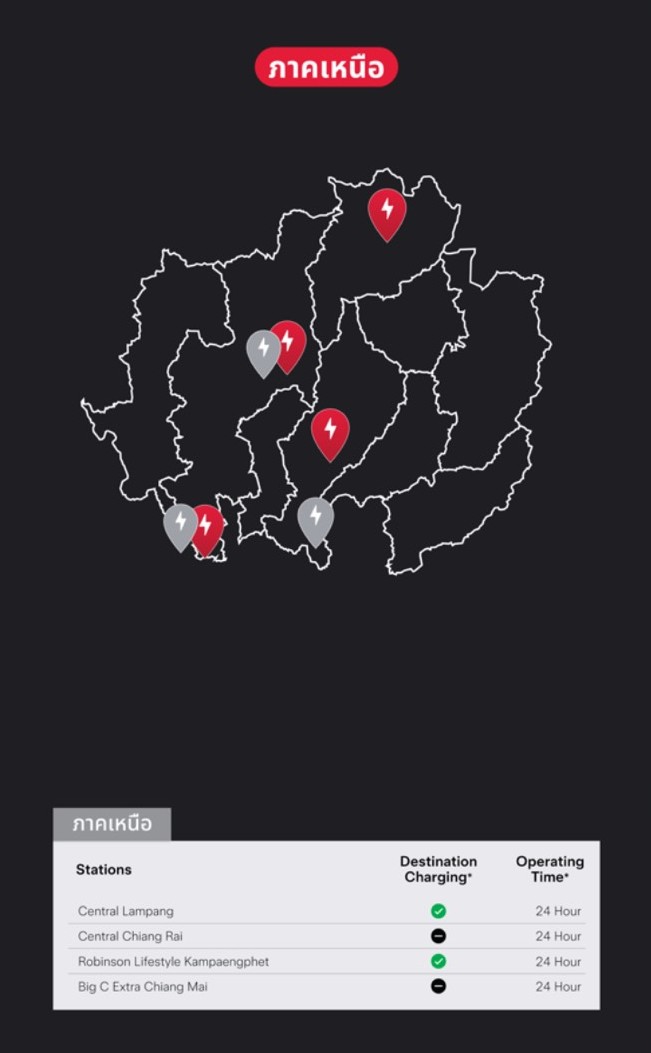 20.สถานี TESLA SUPERCHARGE เชียงราย พิกัดหน้าห้างเซ็นทรัล เชียงราย เลขที่ 99/9 ถ.พหลโยธิน จ.เชียงราย ติดตั้งเครื่องชาร์จ 4 Supercharger กำลังสูงสุด 250kW รองรับระบบชาร์จ CCS จำนวน 4 เครื่อง เปิดให้บริการทุกวัน ตลอด 24 ชั่วโมง