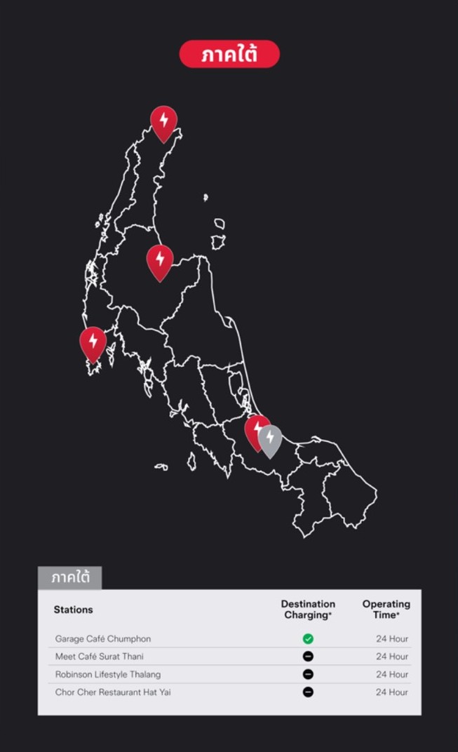 32.สถานี Tesla Supercharging ที่ร้าน ฌ. เฌอ หาดใหญ่ บริเวณลานจอดรถด้านหน้า ติดตั้งเครื่องชาร์จแบบ DC ชาร์จเร็ว/แรงสูงสุด 250 กิโลวัตต์ (kW) จำนวน 4 เครื่อง 4 ช่องชาร์จ เปิดให้บริการ 24 ชั่วโมง พิกัด : ถนนเลี่ยงเมืองติดกับ 3K homebase สายเอเชีย โทร. 093-1566465 / 083-1195222