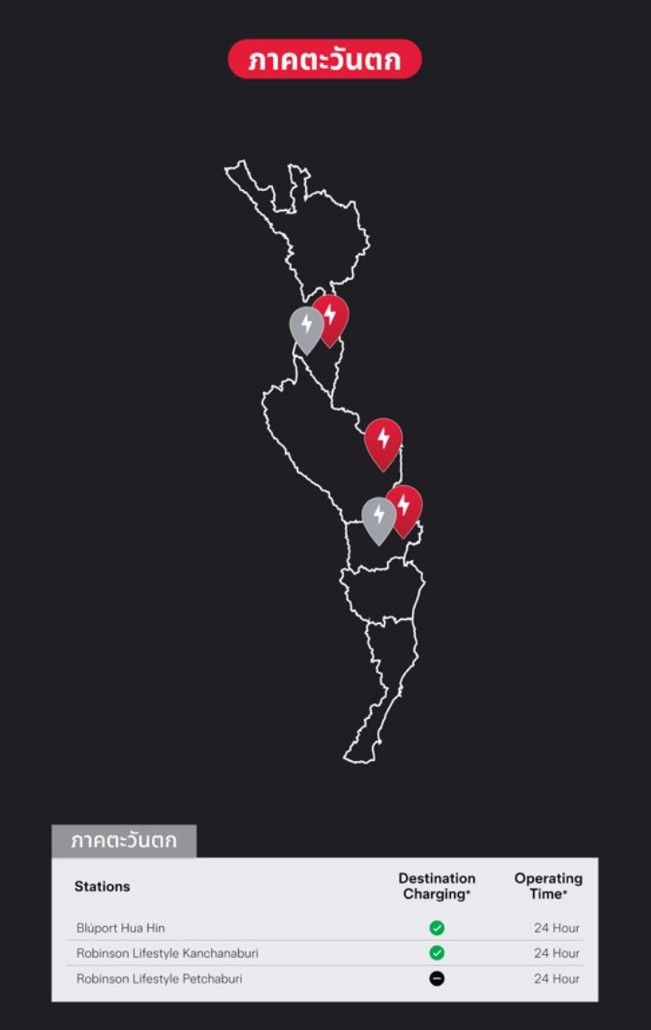 19.สถานี SUPERCHARGE กาญจนบุรี พิกัดลานจอดรถกลางแจ้งหน้าห้าง โรบินสัน ไลฟ์สไตล์ ติดตั้งเครื่องซูเปอร์ชาร์จขนาด 250 กิโลวัตต์ จำนวน 4 เครื่อง พร้อมเครื่องชาร์จ AC Destination Chargers เปิดให้บริการ 24 ชั่วโมง