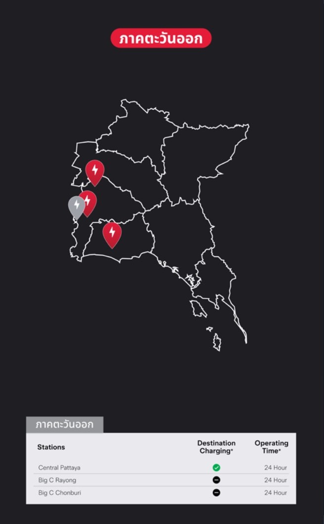 25.สถานี Tesla Supercharger ที่ BigC Rayong จ.ระยอง บริเวณลานจอดรถหน้าห้าง ติดตั้งเครื่องชาร์จแบบ DC ชาร์จเร็ว/แรงสูงสุด 250 กิโลวัตต์ (kW) จำนวน 4 เครื่อง 4 ช่องชาร์จ เปิดให้บริการ 24 ชั่วโมง