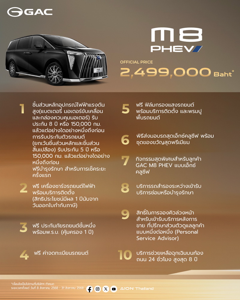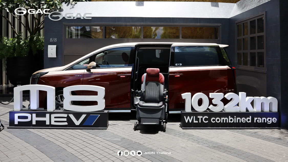 GAC Thailand เปิดตัวรถ MPV 7 ที่นั่ง “M8” PHEV Master the Moment เครื่องยนต์ Plug-in Hybrid วิ่งด้วยไฟฟ้าได้ไกลประมาณ 120 กม. (มาตรฐาน NEDC) และระยะทางรวมสูงสุดกว่า 1,032 กม. (มาตรฐาน WLTC) ราคาเริ่มต้น 2,499,000 บาท*