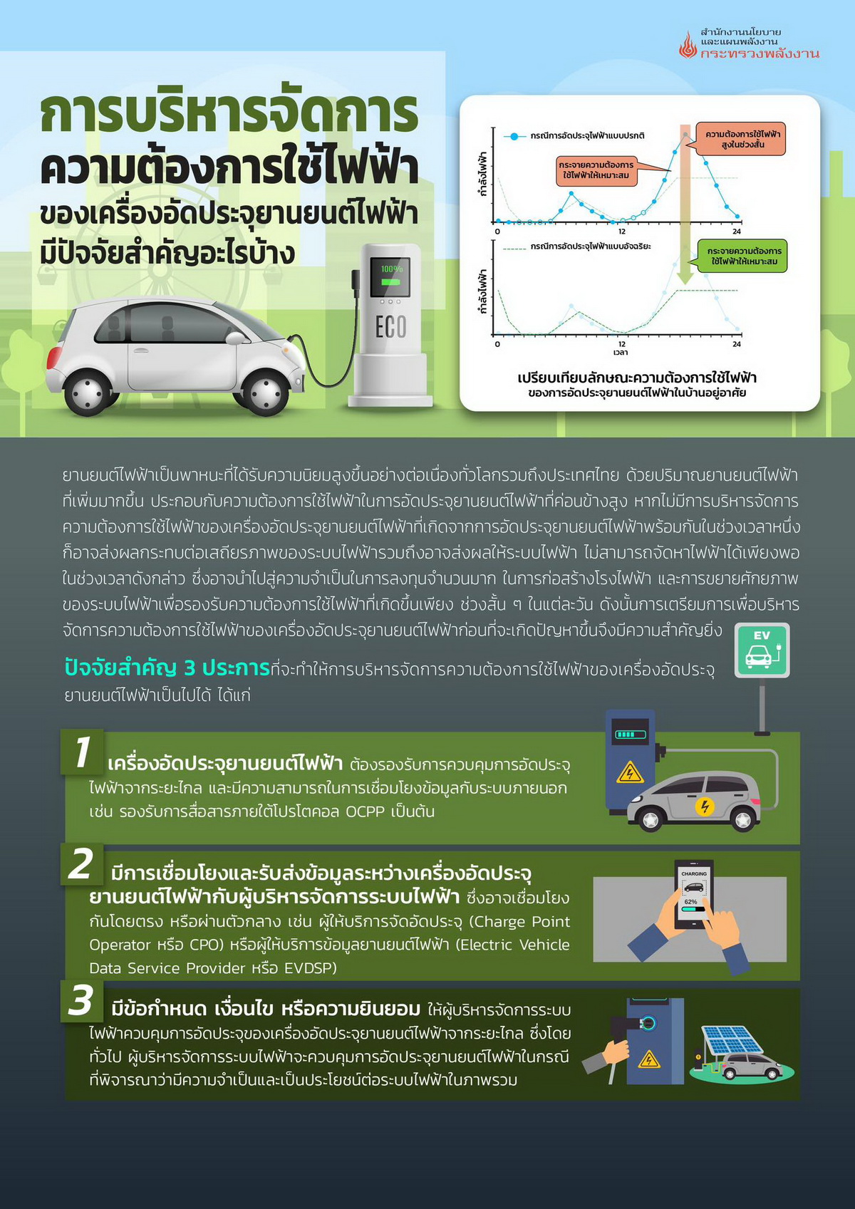 สำนักงานนโยบายและแผนพลังงาน (สนพ.) เผยข้อมูลเกี่ยวกับการบริหารจัดการความต้องการใช้ไฟฟ้าของเครื่องอัดประจุยานยนต์ไฟฟ้าไม่ให้กระทบเสถียรภาพระบบไฟฟ้ามี 3 ปัจจัยสำคัญ คือ