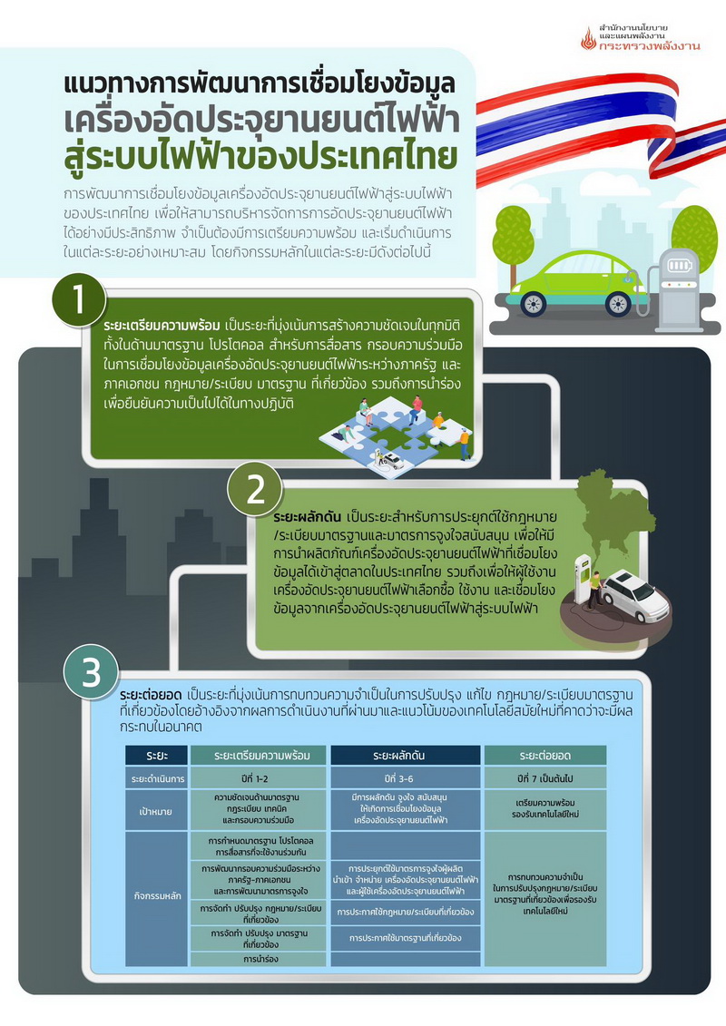 เพื่อบริหารการชาร์จ EV ให้มีประสิทธิภาพ ประเทศไทยต้องเดินหน้าเป็นขั้นตอน สนพ.ระบุ การเชื่อมข้อมูลเครื่องชาร์จ EV สู่ระบบไฟฟ้าของไทย มีการดำเนินการ 3 ระยะ ที่สำคัญ คือ !!