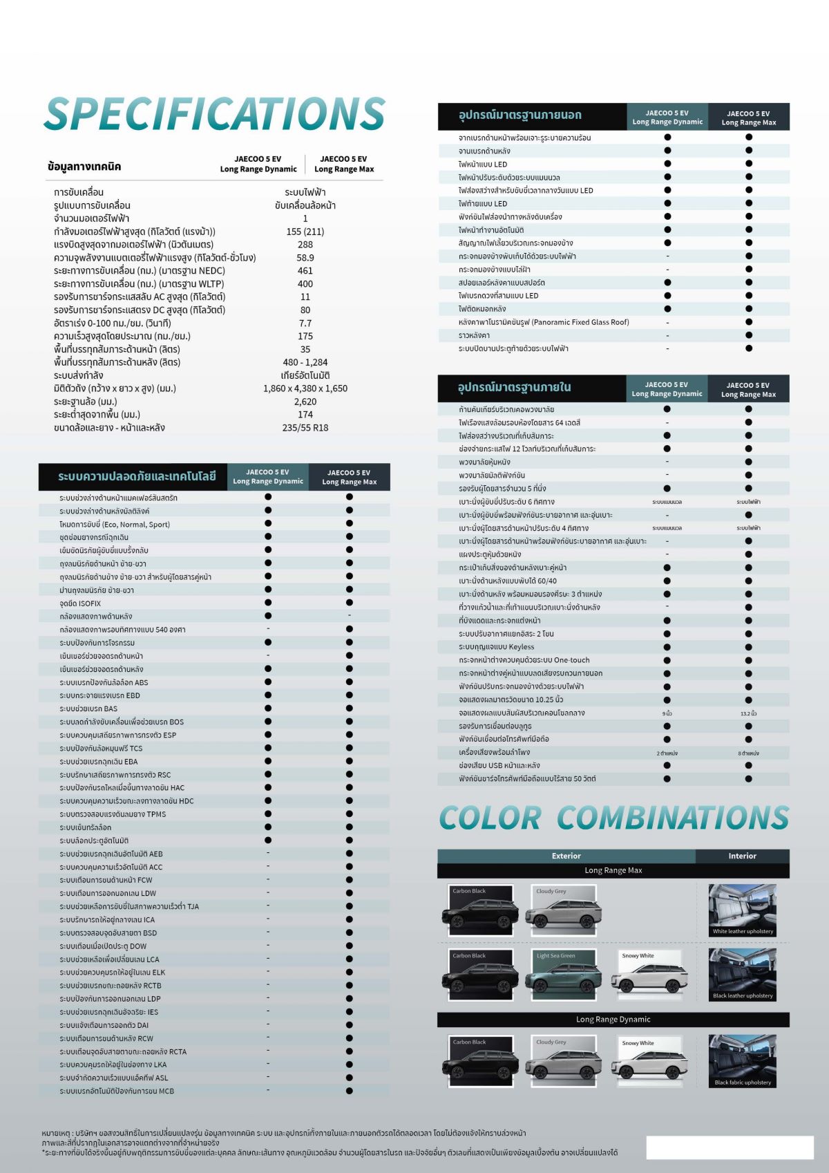 JAECOO 5 EV มีให้เลือก 2 รุ่นย่อย ได้แก่ JAECOO 5 EV Long Range Max และ JAECOO 5 EV Long Range Dynamic โดยรุ่น JAECOO 5 EV Long Range Max การตกแต่งภายในโดดเด่นด้วยเบาะหนังสังเคราะห์พรีเมียม เบาะปรับไฟฟ้า หน้าจอสัมผัสขนาด 13.2 นิ้ว ไฟเรืองแสงปรับได้ 64 สี กล้องรอบคัน 540° หลังคาพาโนรามิค (Panoramic Fixed Glass Roof) ขนาดใหญ่ถึง 1.45 ตร.ม.ทั้งยังมีประตูท้ายไฟฟ้าเพื่อความสะดวกสบายสูงสุด มีสีภายนอกให้เลือก 5 สี และสีภายใน 2 สี (ขึ้นอยู่กับ combination ของแต่ละสีรถภายนอก) ส่วนรุ่น JAECOO 5 EV Long Range Dynamic มาพร้อมเบาะผ้า หน้าจอสัมผัสขนาด 9 นิ้ว กล้องรอบคัน 360° มีสีภายนอก 3 สี และสีภายใน 1 สี ที่มาพร้อมระบบความบันเทิงครบครัน รวมถึงโหมดคาราโอเกะในรถ