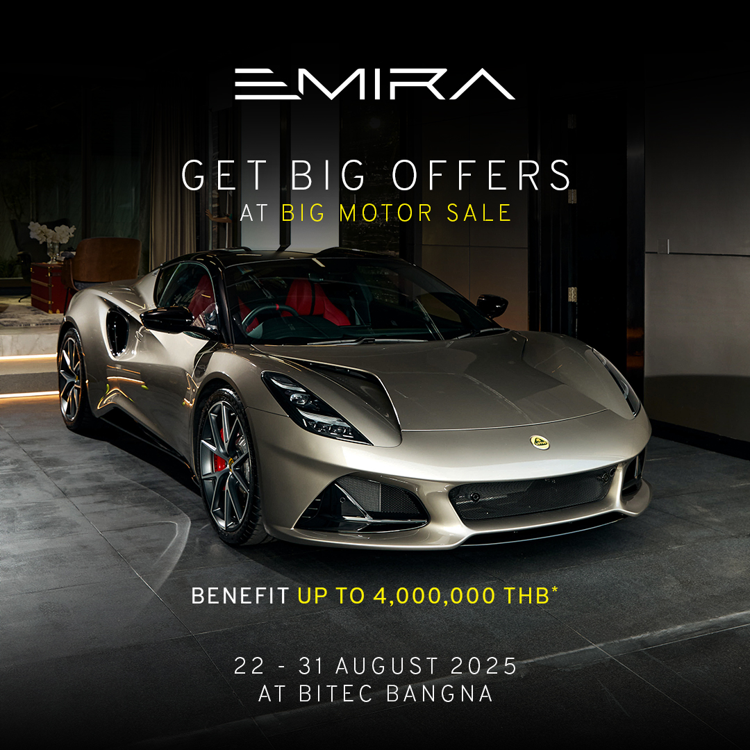 ขณะเดียวกันในส่วนของรถยนต์สันดาปนั้น เป็นการตอกย้ำ คอนเซปต์ ‘Lotus For Everyone’ พร้อมมอบสิทธิพิเศษเฉพาะงาน Big Motor Sale 2025 ด้วยข้อเสนอพิเศษมูลค่าสูงสุด 4 ล้านบาท สำหรับรถสปอร์ต อย่าง Lotus Emira First Edition V6 ด้วยการเปิดจองในราคาที่ดีที่สุดแห่งปี เพียง 8.99 ล้านบาท ด้วยเครื่องยนต์เบนซิน V6 ขนาด 3.5 ลิตร ซูเปอร์ชาร์จ (Supercharged) รุ่นพิเศษที่คุ้มค่าแก่การครอบครอง และ Lotus Emira First Edition i4 เครื่องยนต์ 2.0 ลิตร เทอร์โบ (I4) เปิดจองราคาพิเศษที่ไม่เคยมีมาก่อน เพียง 7.99 ล้านบาท* มาพร้อมเกียร์ 8 Speed dual clutch พร้อมพวงมาลัยแบบไฮดรอลิก ตอบสนองการขับขี่ได้อย่างแม่นยำ