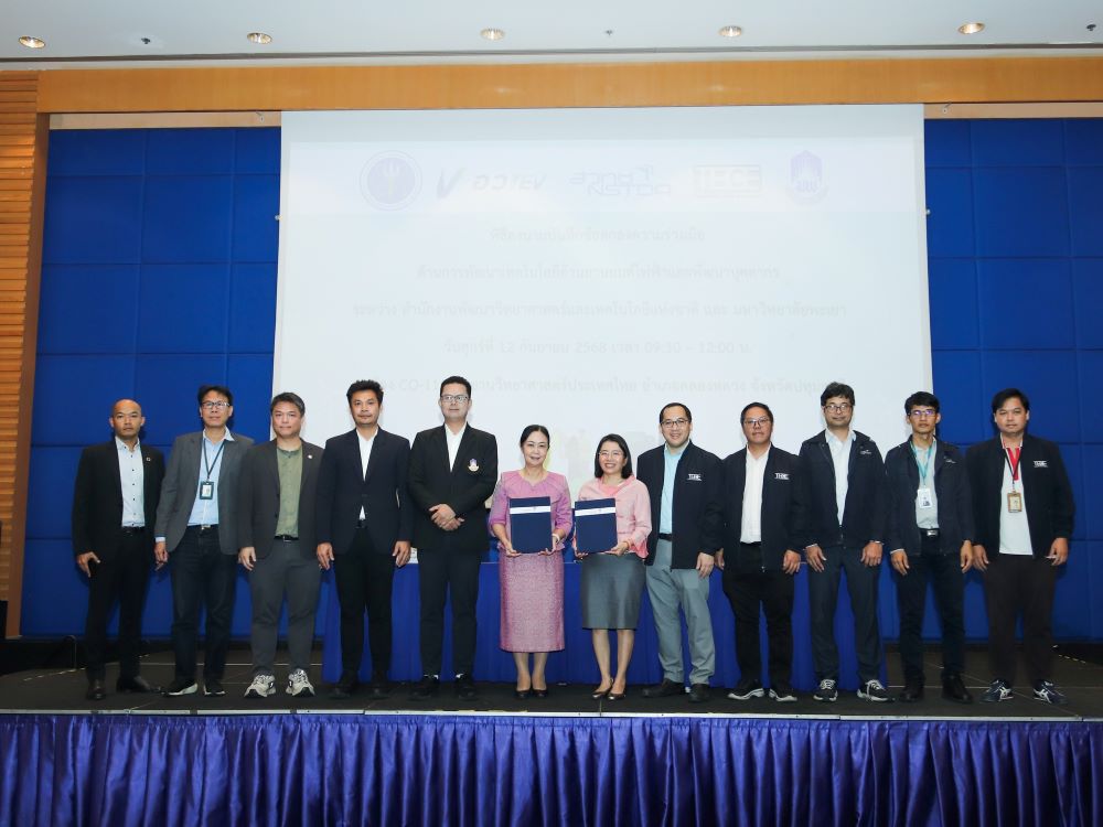 สำนักงานพัฒนาวิทยาศาสตร์และเทคโนโลยีแห่งชาติ (สวทช.) โดย ดร.สุมิตรา จรสโรจน์กุล ผู้อำนวยการศูนย์เทคโนโลยีพลังงานแห่งชาติ สวทช. ลงนามบันทึกข้อตกลงความร่วมมือ (MOU) กับ มหาวิทยาลัยพะเยา โดย รองศาสตราจารย์ ดร.สุภกร พงศบางโพธิ์ อธิการบดีมหาวิทยาลัยพะเยา ในการพัฒนาเทคโนโลยีและบุคลากรด้านยานยนต์ไฟฟ้า โดยมี ดร.ชินะ เพ็ญชาติ ผู้อำนวยการกลุ่มวิจัยศูนย์เทคโนโลยีโลหะและวัสดุแห่งชาติ สวทช. และผู้ช่วยศาสตราจารย์ สุวิทย์ ปัญญาวงศ์ รองอธิการบดีฝ่ายสิ่งแวดล้อมและภูมิทัศน์ มหาวิทยาลัยพะเยา ร่วมเป็นพยาน ณ อุทยานวิทยาศาสตร์ประเทศไทย เมื่อวันที่ 12 กันยายน 2568