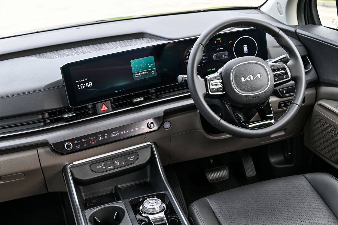 ห้องโดยสารของ The new Kia Carnival HEV 7-seater ได้รับการออกแบบให้กว้างขวางและร่วมสมัยด้วยดีไซน์ใหม่ ประกอบด้วยจอโค้งแบบพาโนรามิกที่ผสานรวมจอแสดงผลแบบคลัสเตอร์ขนาด 12.3 นิ้ว หน้าจออินโฟเทนเมนท์แบบสัมผัสขนาด 12.3 นิ้ว เข้าไว้ด้วยกันแบบไร้รอยต่อ มีระบบเชื่อมต่อ Android Auto™ และ Apple CarPlay® แบบไร้สายและฟังก์ชันสั่งงานด้วยเสียง มีระบบปรับอากาศด้านหน้าแบบอัตโนมัติที่สามารถปรับอุณหภูมิได้แบบแยกอิสระทั้งโซนด้านหน้าฝั่งซ้าย-ขวา และโซนด้านหลัง