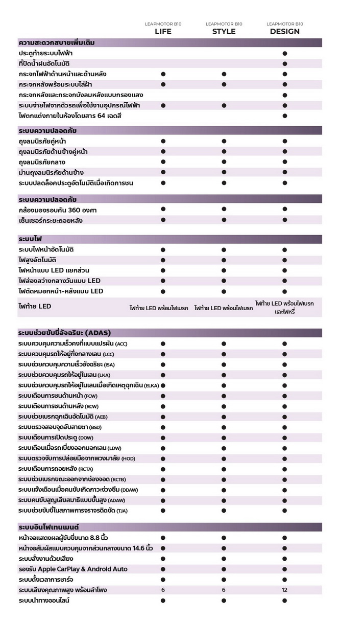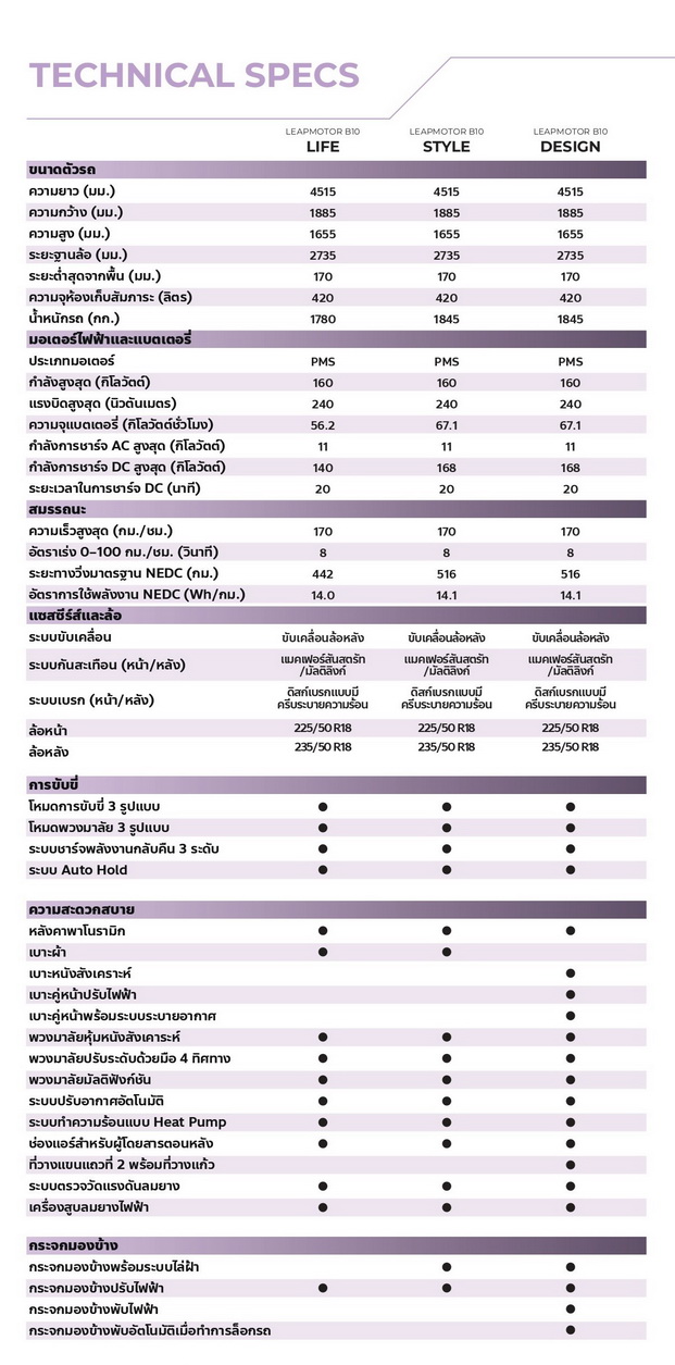 Leapmotor B10 รุ่น Design ขนาดแบตเตอรี่ 67.1 kWh ระยะทาง 516 กม. (NEDC) ราคาเริ่มต้น 798,000 บาท (ราคาแคมเปญ PRE Booking 788,000 บาท)