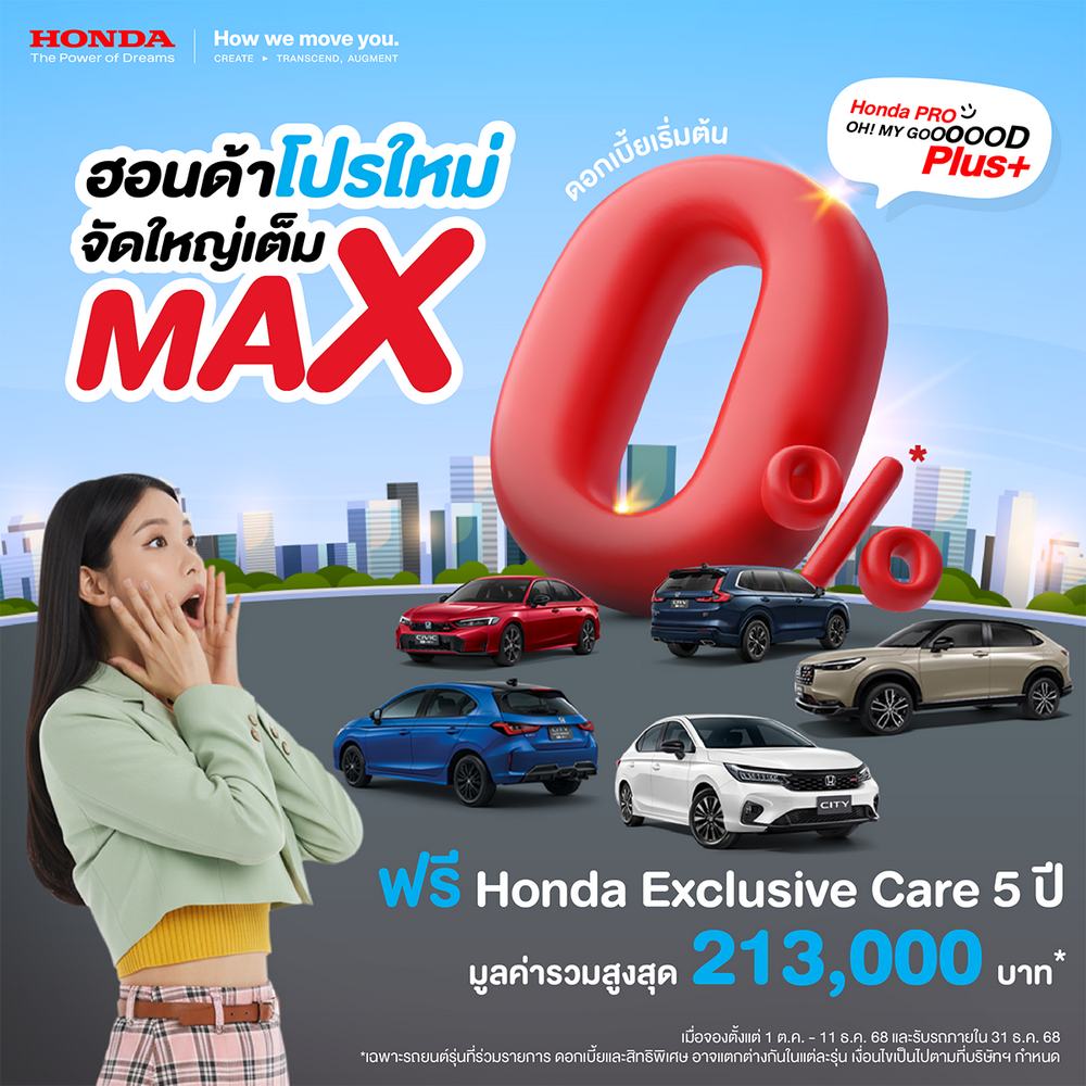 บริษัท ฮอนด้า ออโตโมบิล (ประเทศไทย) จำกัด ยกขบวนความคุ้มแบบ พลัส พลัส กับแคมเปญ “Honda Pro OH! MY GOOOOOD PLUS+” โปรใหม่ จัดใหญ่เต็ม MAX เสิร์ฟความสุขครั้งใหญ่ ส่งท้ายปี 2568 กับข้อเสนอที่หลากหลาย “ตรงใจ เลือกได้เอง” สำหรับรถยนต์ฮอนด้าทุกรุ่นทุกเซกเมนต์ ครอบคลุมทั้งรถยนต์ไฟฟ้า 100% รถขุมพลังฟูลไฮบริด e:HEV – The EXCITING Hybrid และขุมพลัง TURBO มอบสิทธิพิเศษแบบฉ่ำ ๆ มูลค่าสูงสุดถึง 85,000 บาท เพื่อให้ทุกคนเป็นเจ้าของรถยนต์ฮอนด้าได้ง่าย ๆ เมื่อจองตั้งแต่วันที่ 1 ตุลาคม – 11 ธันวาคม 2568 และรับรถภายในวันที่ 31 ธันวาคม 2568